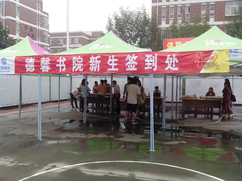 新乡校区大门口,“Dreamit,doit!(有梦就去追)”这句充满青春激情的主题标语吸引了众人的目光,成为今年学院迎新的一道亮丽的风景线。校园主干道上空飘扬着绿白交替的小彩旗,象征学子们青春的梦想;迎新广场四周喷绘,刊载了多条学校对新生的寄语,多幅校园照片把新生引入多彩的大学生活。