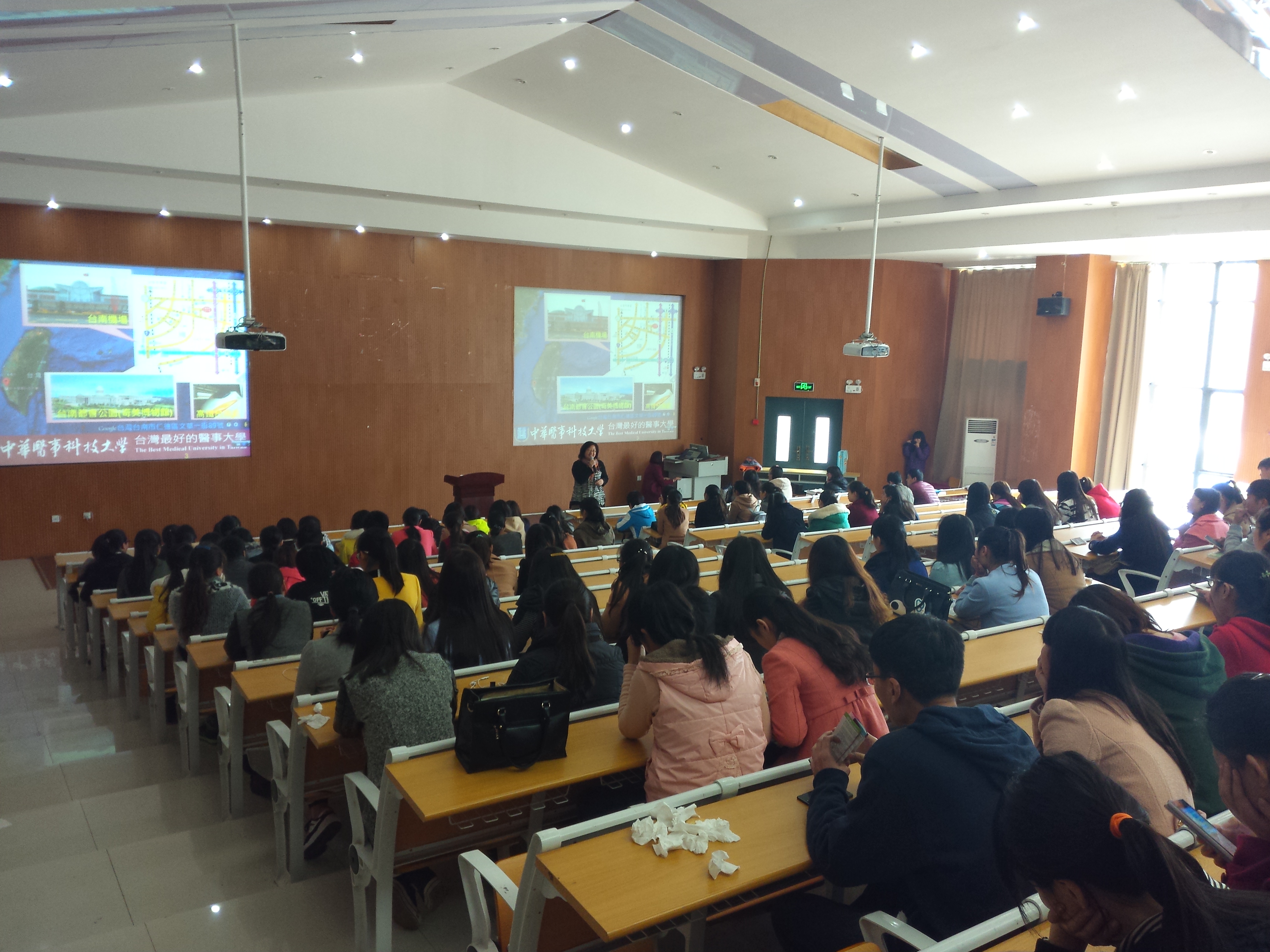 洪芸樱老师以幽默风趣的开场方式拉近了与学生的距离,使会场气氛立马轻松热烈起来,接下来洪老师从中华医事科技大学的基本校况、办学宗旨、教学优势和地理环境等方面,充分展示了台南特殊的风土人情,强调两岸交流不仅仅是一次学习之行更是一场文化与美食之旅,不仅吸引了学生们的眼球,也带来了阵阵热烈的掌声。