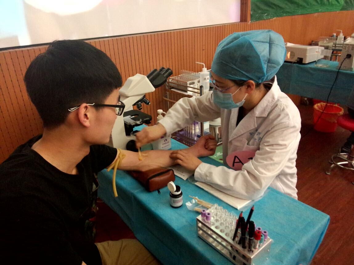 本次比赛共有十二个代表队九十六名同学参加。现场设四个实验操作台,有显微镜、微量移液枪、试管等多种实验器材,教育技术中心录播室进行比赛全程实时现场直播,将比赛选手的操作细节清晰地显示在现场两个大屏幕上。比赛共设有微课程展示、静脉采血、血涂片制备、白细胞计数、血红蛋白测定、有问必答6个环节。“一针见血”静脉采血环节中,各选手屏住呼吸,表情严肃,动作迅速规范,做到了真正的“一针见血”; “心灵手巧”血涂片制备环节,参赛同学按要求进行手指采血,制作出相应的血涂片,进行染色观察,并在规定时间得出实验结果,同时还要进行血型鉴定以及倍比稀释试验,评委老师检查过每个显微镜后给出分数;有问必答环节选手们在答题纸上写出细胞名称,选手们的高正确率赢得全场同学的热烈掌声。