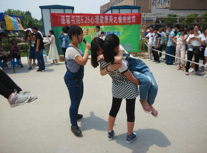 活动中,参赛的同学们两两结合,可以以“公主抱”或“背对背抱”等拥抱方式来进行的一场持久赛,比赛中坚持时间最久的三组为冠军、亚军、季军,并可得到不同的奖品。