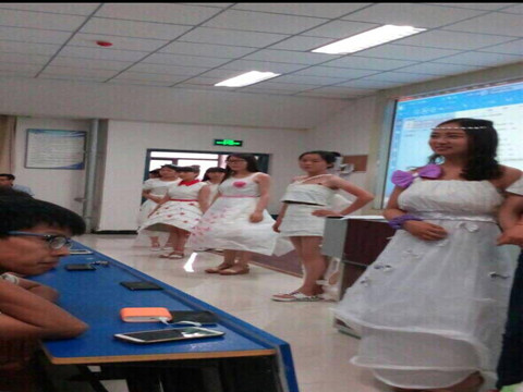 晚会以一段歌舞串烧拉开序幕,同学们集思广益、共同制作的手工纸质婚纱T台秀将晚会推向高潮,紧接着是“大胃王”的一系列游戏,像吃西瓜、喝雪碧大赛,同学们都积极参加并获得了丰厚的礼品。晚会以各个班带来的节目收尾,精彩的表演更是获得阵阵掌声。