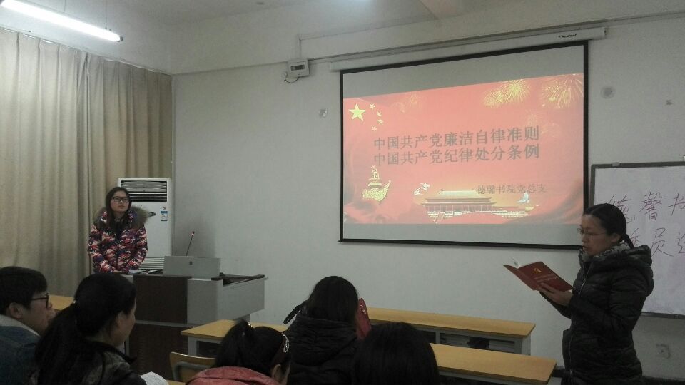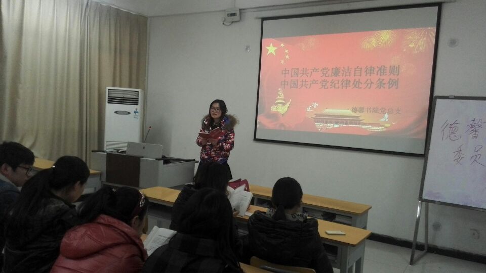 为认真学习贯彻中办印发的《关于认真学习贯彻<中国共产党廉洁自律准则>和<中国共产党纪律处分条例>的通知》精神,进一步提升党员干部的廉洁自律意识,根据学校学期党建重点工作及党支部每月学习安排,11月25日下午,德馨书院党总支组织全体职工党员、在校学生党员集中学习《中国共产党廉洁自律准则》和《中国共产党纪律处分条例》。