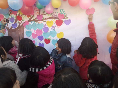 新乡医学院三全学院德馨书院的志愿者带领孩子们进行素质体验游戏,抢板凳、水果蹲、疯狂人体设计……孩子们组成了一支支小队,并有自己的队名、队歌和口号。比赛在孩子们高亢的口号嘹亮的队歌中拉开帷幕,游戏竞争十分激烈,孩子们和志愿者相处的十分愉快,一个个脸上都洋溢着幸福而又满足的笑容,最后孩子们在志愿者带领下依次在“成长树”上贴上自己准备的爱心卡片,卡片上写满了孩子们自己对未来的期待和祝福,其中一个孩子在卡片上写下“爸爸妈妈我爱你们,虽然我不能像其他孩子那样整天的和你们在一起,但是我知道你们是爱我的,我会好好学习,长大之后好好的孝顺你们,我爱你们。”看着孩子们简答而又深情的话语,我们内心也为之触动,活动在孩子们欢快的笑声中圆满结束。
