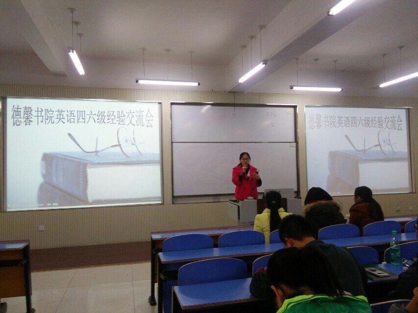 12月10日中午,德馨书院“英语四六级经验交流会”在第一教学楼B303教室举办。本次英语交流会邀请了在往届英语四六级考试中成绩优异的刘亚迪、白秋梦、王淏、张乃丹四位同学,德馨书院200余人参加了本次活动。