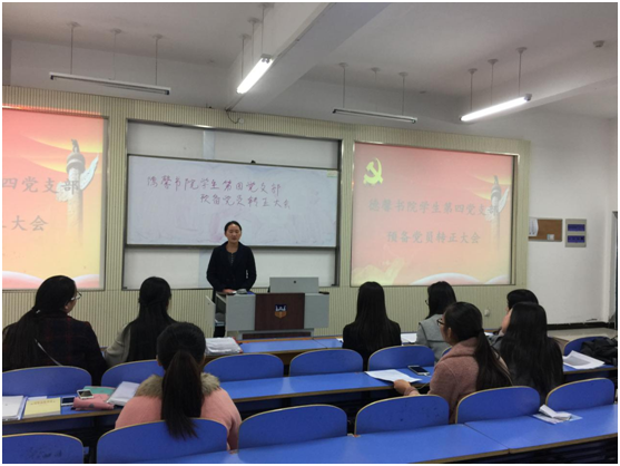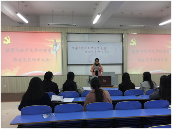 德馨书院第四党支部于11月9日在第一教学楼B201教室召开预备党员转正大会。该会议由德馨书院第四党支部书记侯力滋老师主持,德馨书院2名正式党员,3名预备党员参加此次大会。