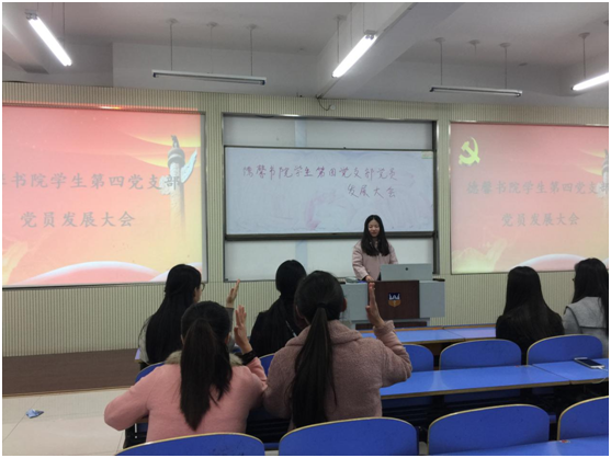 由组织委员王倩倩宣布德馨书院学生第四党支部党员发展大会正式开始。首先请5位发展党员陈明明,李乐、张祎琦,李盈佳,李梦依次做了简要的自我介绍并宣读《入党志愿书》。由各个入党介绍人依次对发展党员进行评价。之后,由参会的各位党员对发展对象在思想、政治、学习、生活等方面的表现做了客观的发言,并指出其优缺点。最后,经正式党员举手表决,全票通过张明明,李乐、张祎琦,李盈佳,李梦5位同志正式成为中共预备党员并加入德馨书院第四党支部。