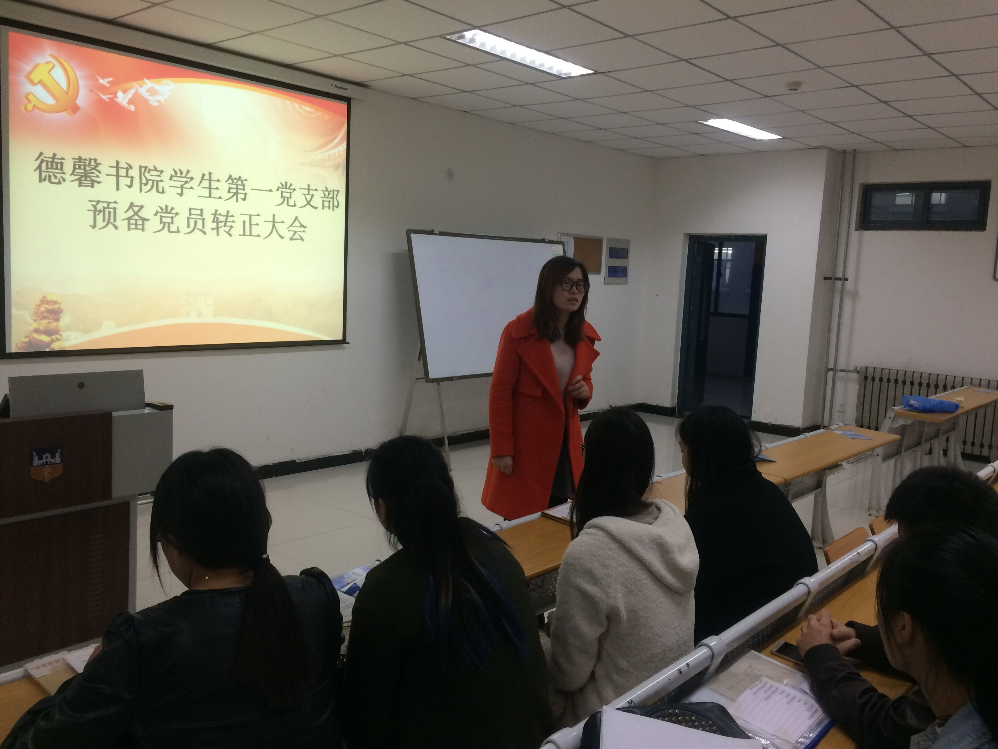 11 月 23 日,德馨书院学生第一党支部预备党员转正大会在第一教学楼 C203 教室召开,大会严格按照预备党员转正的规定流程进行,讨论尹媛媛等 4位同志的入党转正问题。此次会议由德馨书院学生第一党支部书记侯永爽老师主持,支部全体正式党员和预备党员同志参加此次会议。