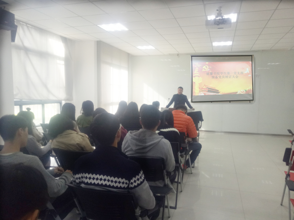 11月10 日,德馨书院学生第一党支部预备党员转正大会在第一教学楼B104教室召开,大会严格按照预备党员转正的规定流程进行,讨论李家磊,王淏,刘亚迪,李若梦4位同志的入党转正问题。此次会议由德馨书院学生第一党支部书记熊天露老师主持,支部全体正式党员和预备党员同志参加此次会议。