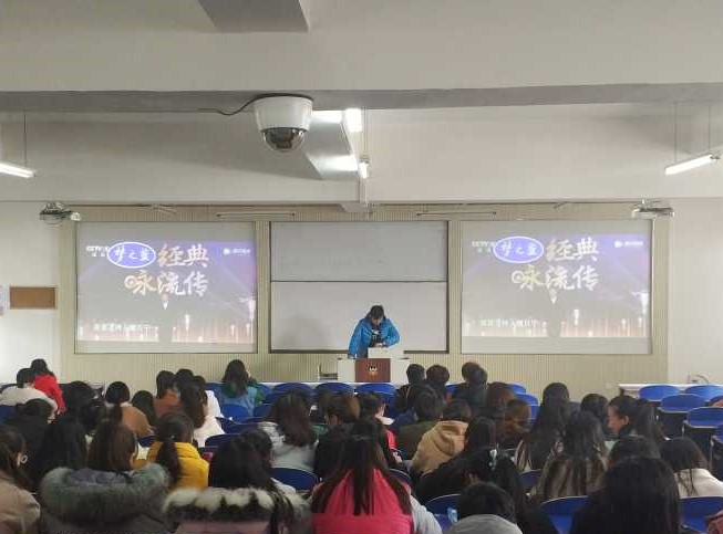 活动开始时,由学生会志愿者引导同学们有序进入教室并向他们讲解此次活动的目的及重要意义,让同学们了解学习传统文化的重要性。活动期间,大家一起观看富有创意的《经典咏流传》节目,它以唱代说。让同学们从新的角度来看古诗词,了解经典诗词背后的文化内涵。各位同学在观影过程中又重新感受到中华古诗词的魅力,引起他们对传统文化的兴趣。