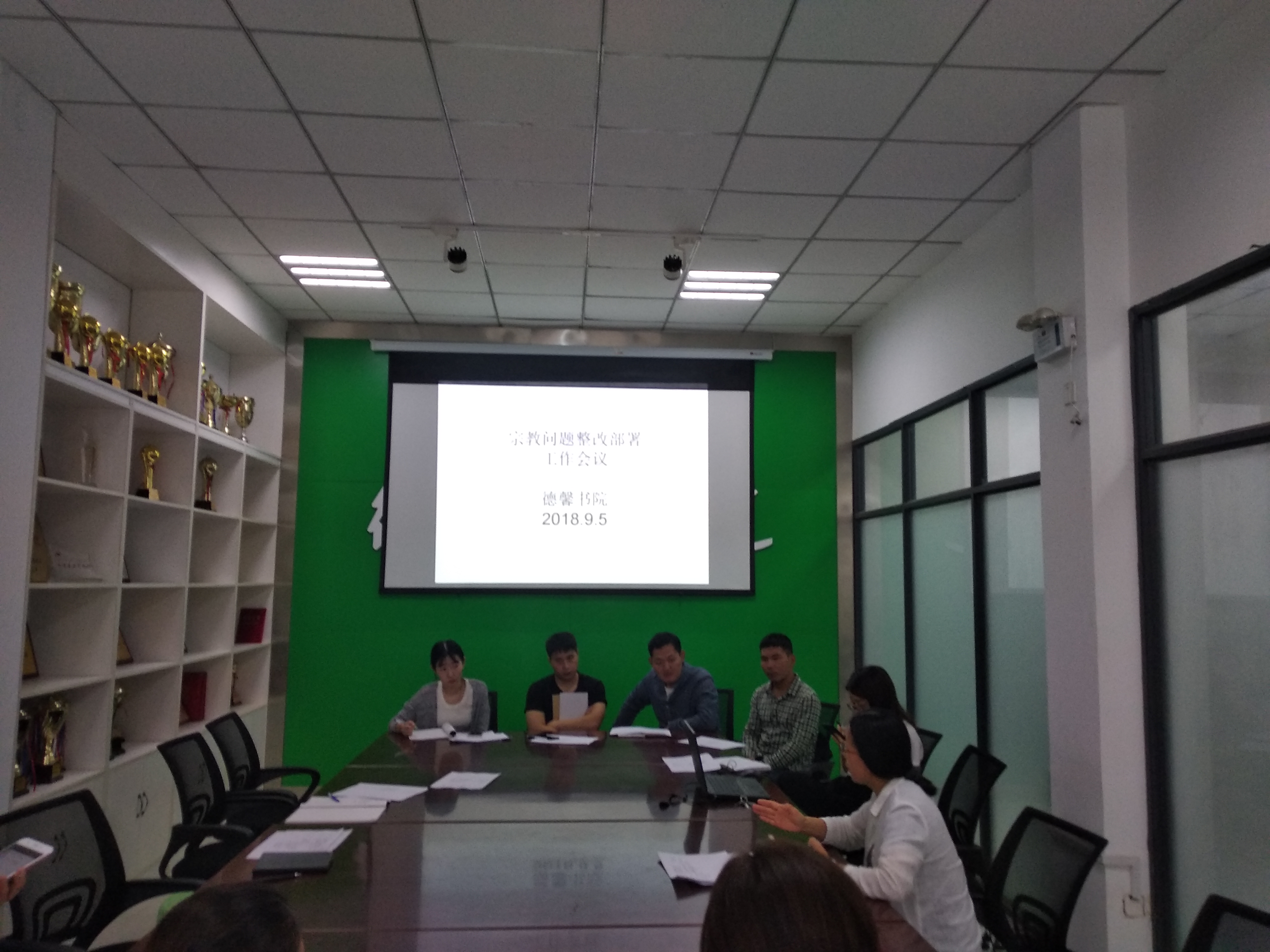 2018年9月5日,德馨书院全体老师召开基督教专项整改会议,首先,德馨书院党总支书记金靖芝传达会议精神,确保思想高度统一,明确责任划分,接着,德馨书院党总支副书记平丹丹对下一阶段基督教专项整改工作进行部署: