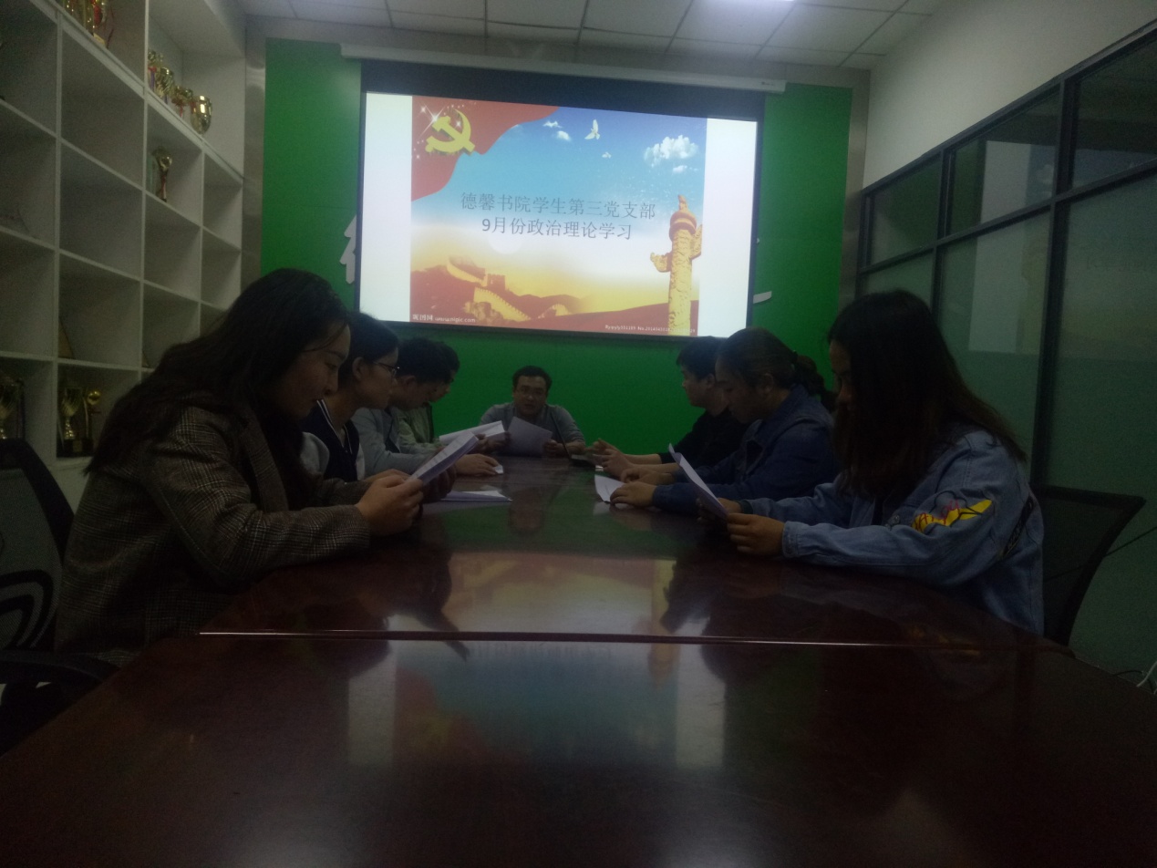 2018年9月5日德馨书院学生第三党支部在德馨书院办公室召开了9月份政治理论学习会议,全体党支部成员在支部书记高明的带领下学习《习近平总书记洽谈治国理政》深刻内涵,结合深入学习习近平总书记在中央全面依法治国委员会第一次会议上的重要讲话精神,引导广大师生牢固树立法治观念,做守法公民。
