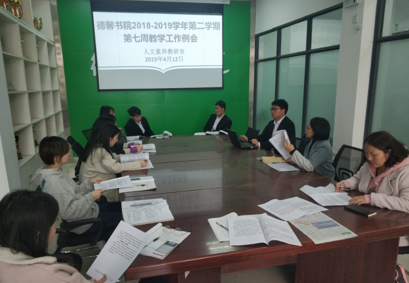 2019年4月12日,德馨书院全体教师在书院办公室召开人文素养教研室本学期第七周教学工作例会。