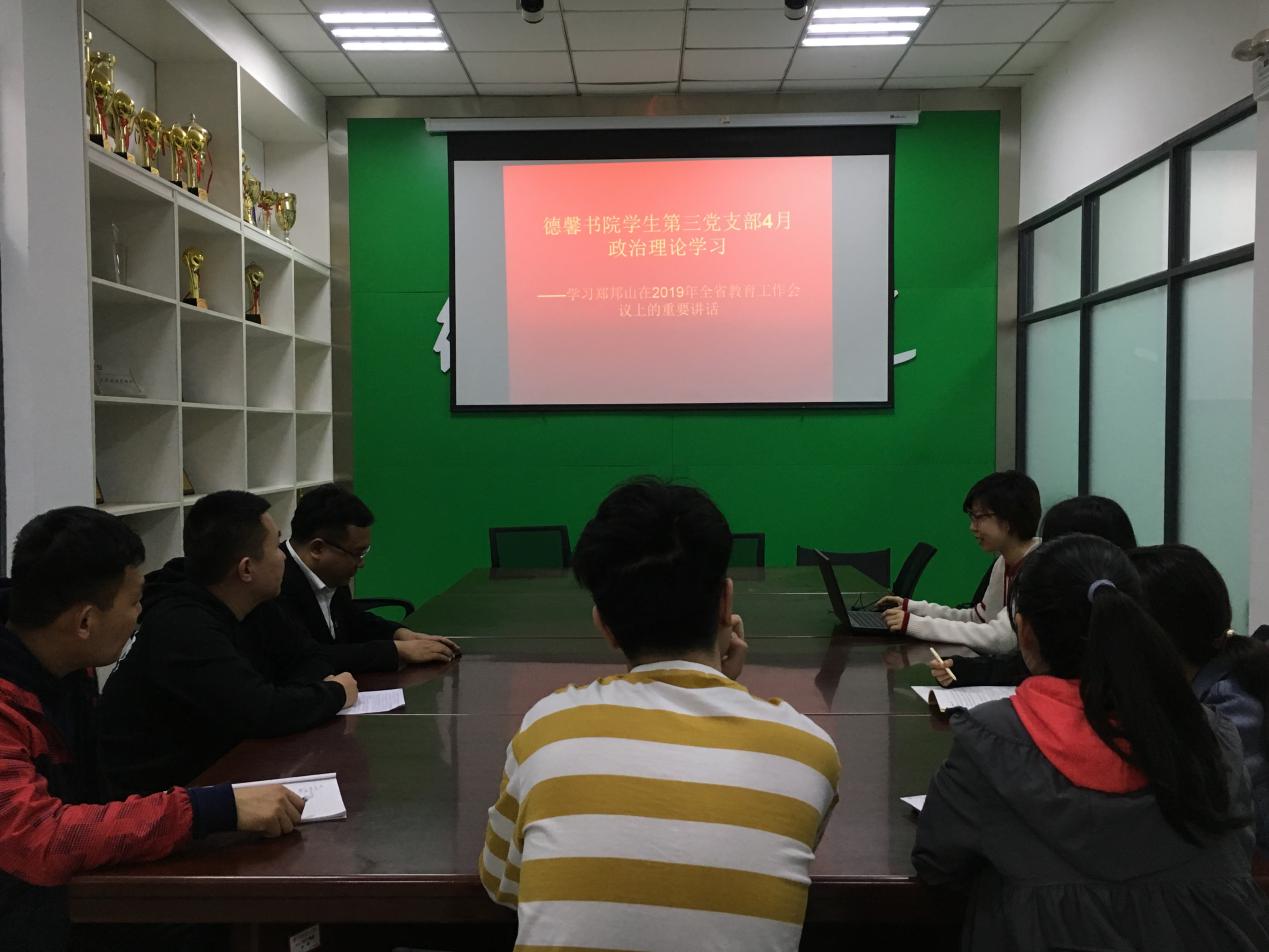4月23日,德馨书院第三党支部在德馨书院办公室开展了四月份政治理论学习活动,会议由党支部书记张晗老师主持,第三党支部全体党员、预备党员参加会议。