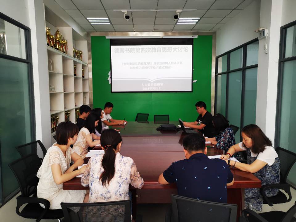 2019年7月1日上午,根据学校教育思想大讨论统一部署以及书院教育思想大讨论活动实施方案安排,德馨书院党总支在书院会议室召开了第四次教育思想大讨论会议。本次教育思想大讨论活动,德馨书院围绕主题《全面贯彻党的教育方针 落实立德树人根本任务 加快推进新时代学校内涵式发展》深入开展本次讨论会。德馨书院人文素养教研室的教师参与了本次大讨论活动,并进行了热烈讨论。