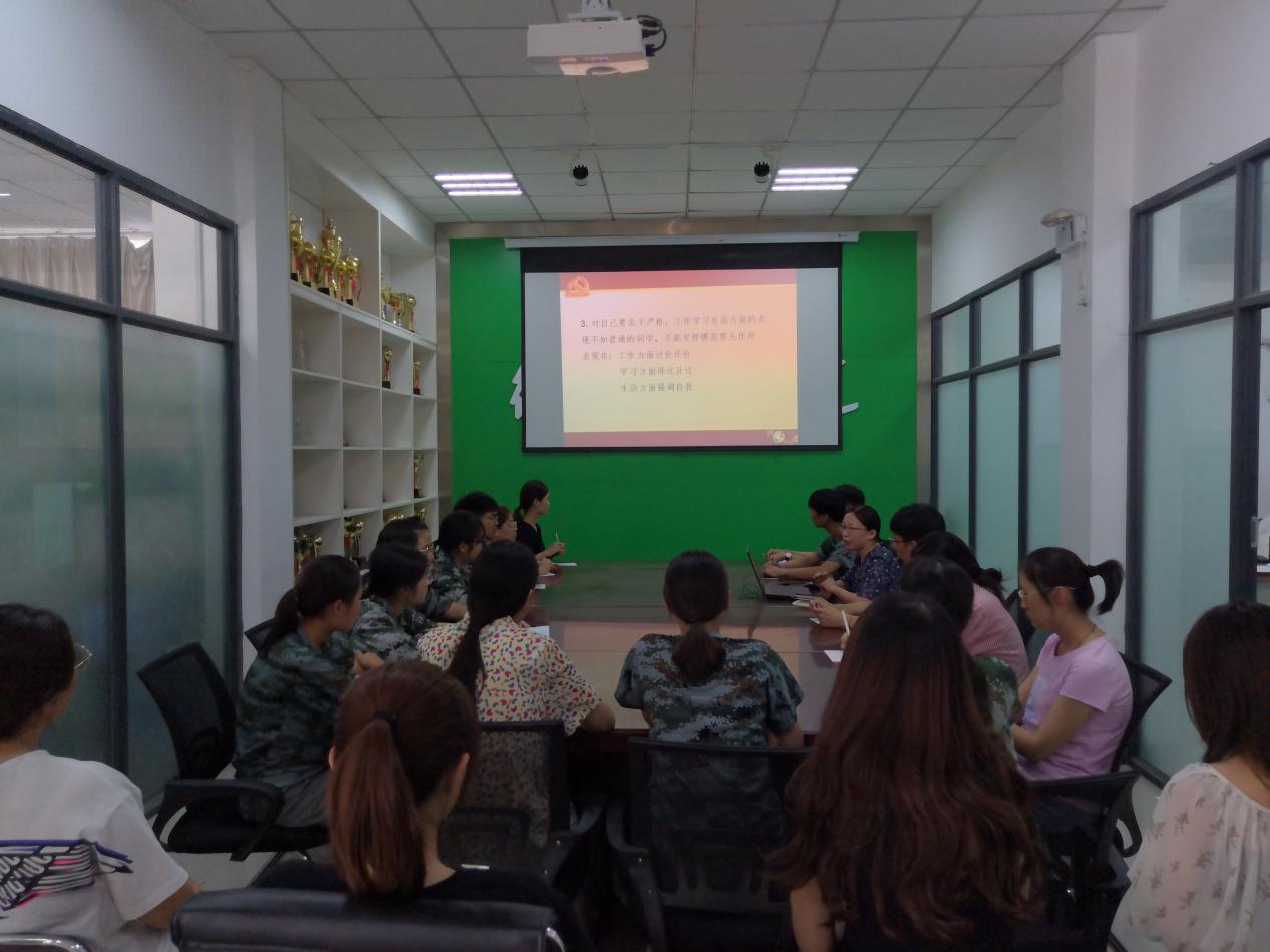 随后,金靖芝书记开始介绍德馨书院党总支党建特色工作开展情况,主要内容有:一、依托党建社区,开展党务特色活动,依托宿舍门洞、长廊、大厅设立大学生党建社区,借助宿舍文化平台将党员教育真正融入到学生日常生活中,为迎接党的十九大,德馨学子以手绘展板、主题手绘报布置党建社区,以别样的形式喜迎十九大的召开。二、加强党员常态化教育,创建党员教育实践基地。德馨书院在新乡市平原新区祝楼乡中心小学和林州市石板岩画家村小学建立两个党员教育实践基地,定期为当地的留守儿童进行爱心一对一的帮扶。三、德馨书院成立“习语社”,并开展了“馨心向党筑梦德馨唱响习语新时代”系列活动。其中有“习语”展博室,定期播放《平“语”近人——习近平总书记用典》,还有习语进宿舍、习语进课堂,以及“‘习’语近人”的主题演讲比赛,通过活动的圆满举办,大大提高了我书院党员、团员的爱党意识,激发了德馨书院在校大学生的爱国热情,更加坚定了全体学生跟党走的决心和信念。
