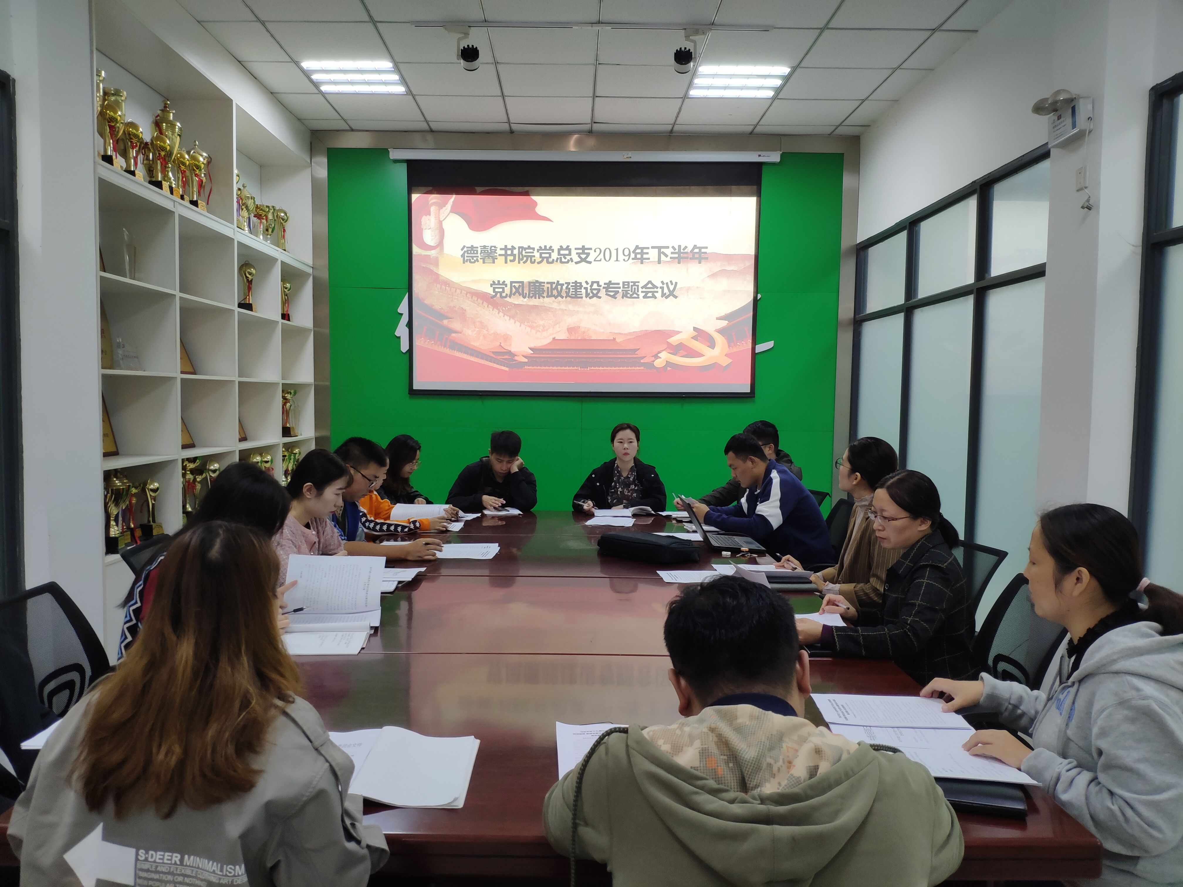 为深入贯彻学习学院党委关于2019年党风廉政建设工作要点,10月11日上午,德馨书院党总支在书院会议室召开了2019年下半年党风廉政建设专题会议,全面总结2019年上半年党风廉政建设工作,安排部署2019年下半年相关工作。书院全体教师参加,会议由德馨书院党总支书记金靖芝主持。