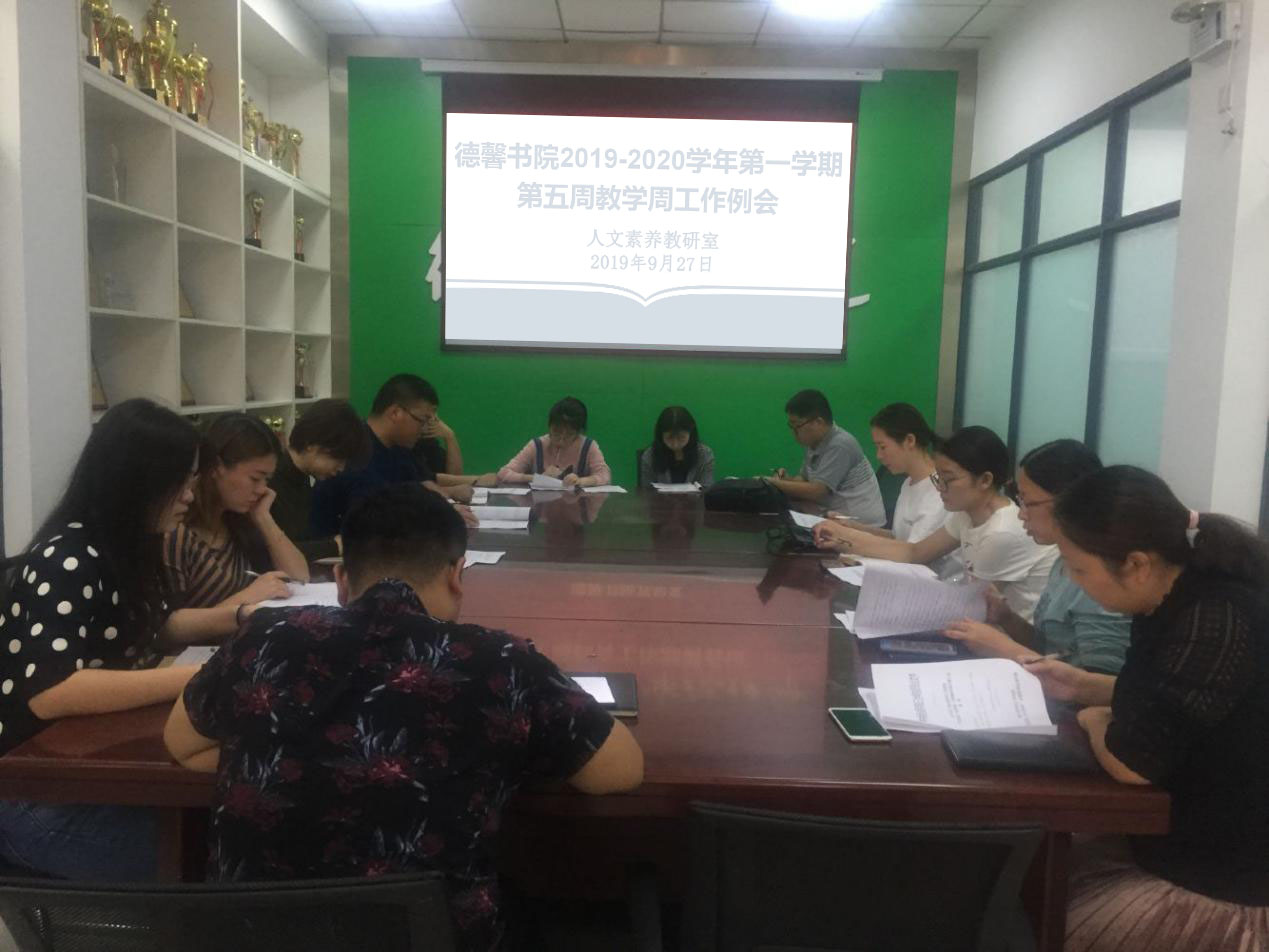 2019年9月27日,德馨书院教师在书院办公室召开人文素养教研室本学期第五周教学工作例会。会上,段玉凤老师就本周及下周工作作了如下安排:
