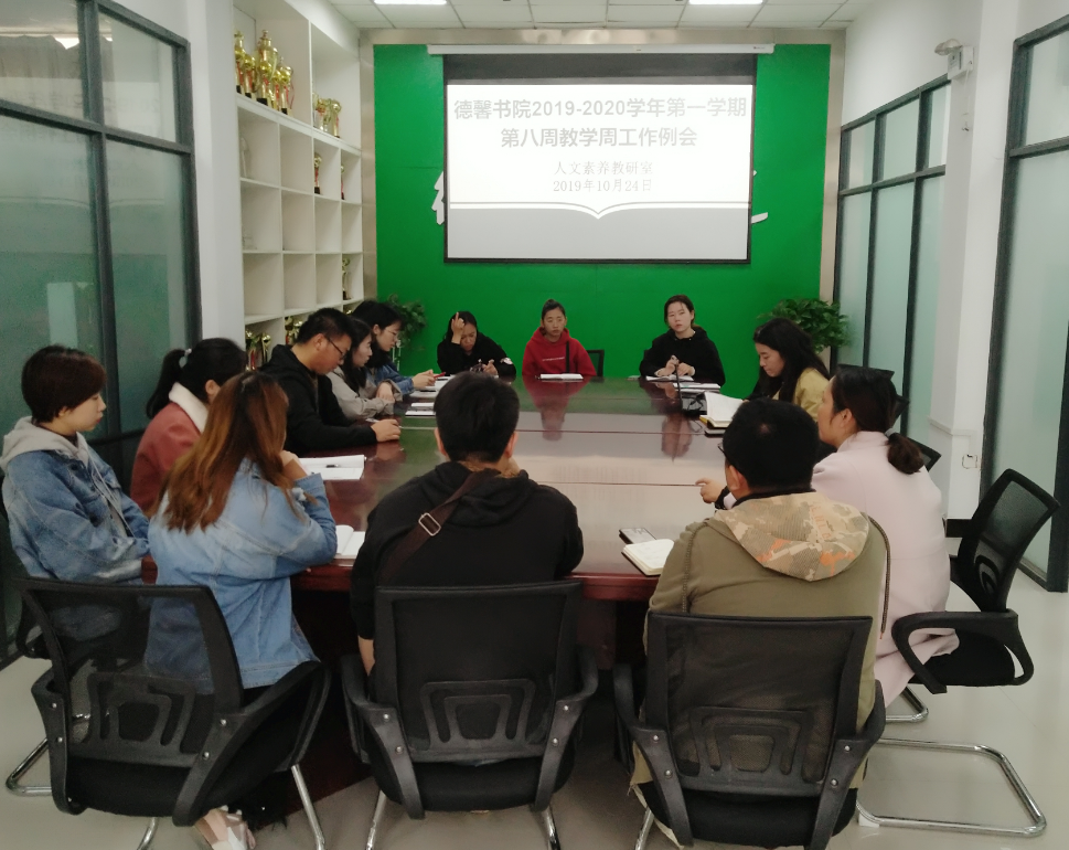2019年10月24日,德馨书院教师在书院办公室召开人文素养教研室本学期第八周教学工作例会。会上,段玉凤老师就本周及下周工作作了如下安排: