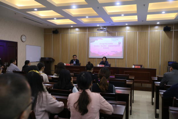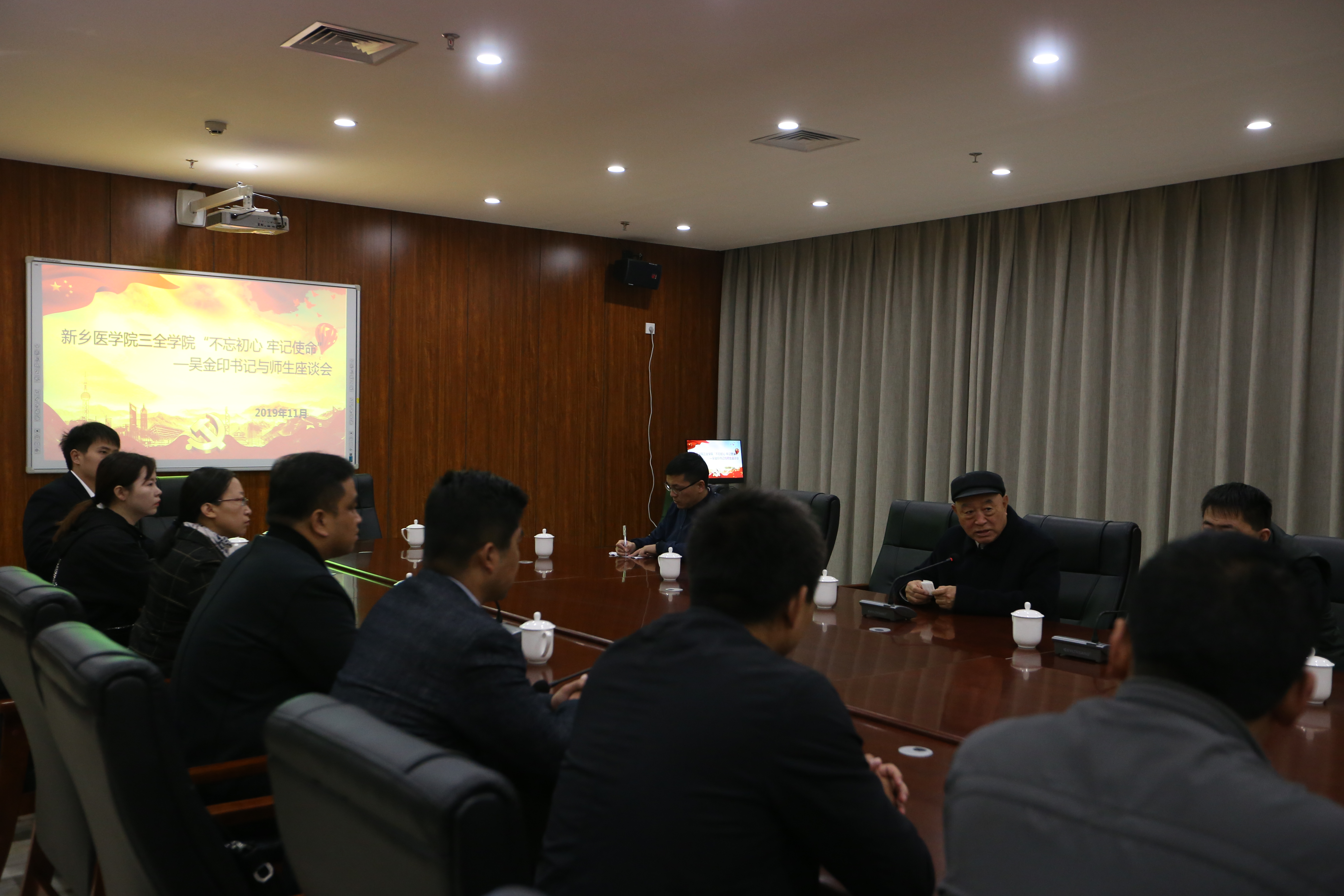 首先,党委书记吴金印与我校师生党员代表开展了“不忘初心、牢记使命”的座谈会。会上,张钢书记介绍了吴金印书记的先进事迹,号召大家要向“改革先锋”吴金印同志学习,对照先进典型、身边榜样、查找差距、为民服务,深入推进我校“不忘初心、牢记使命”主题教育。接着,吴金印向大家介绍了唐庄镇的基本情况以及当前改革发展的成就。他声情并茂地讲道,唐庄镇几十年来的变化与发展,不仅仅是靠党对他的培养和教育、领导对唐庄的关心和支持,更是依靠唐庄人民的艰苦奋斗、各级领导干部心往一处想、劲往一处使,功绩归于党、归于群众。随后,大家与吴金印进行深入的交流,教师代表问到:“吴书记您十八岁就已经是一名共产党员了,那么您当初是有着怎样的信念加入了中国共产党,并且对今天的大学生党性培养又有怎样的建议?”吴金印从两个方面为大家解答了疑惑,一方面是为大家介绍了他的人生经历。他讲到:“我出生于1942年的黑暗社会,当时的人民处于水深火热之中,老百姓过的苦不堪言,是共产党人带领中国人民站起来了,当时我自己就梦想成为一名共产党人。讲到这里时,吴书记由衷地唱出一曲“东方红,太阳升,中国出了个毛泽东......”,引发大家的共鸣,现场的师生党员跟着吴金印一起齐声高唱。另一方面,吴金印表示,作为一名共产党员,一定要坚定新时代共产党人的理想信念,牢记共产党人的初心和使命,甘于奉献,并对我校师生党员致以殷切的希望。大家纷纷表示今天的座谈会深受鼓舞,吴书记为我们师生上了一堂生动的党课,激励大家要不忘初心、牢记使命。座谈会结束后,我校学生代表向吴金印送上鲜花和祝福,我校党委副书记张钢、德馨书院党总支书记金靖芝将我校吉祥物全博士赠予吴金印书记。