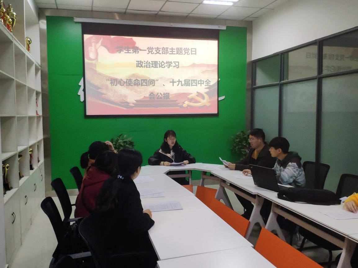 11月19日下午,德馨书院党总支学生第一党支部于德馨会议室开展11月份关于“初心使命四问”及十九届四中全会公报的政治理论学习。会议由党支部书记李丹萌主持,一支部全体在校党员参加。