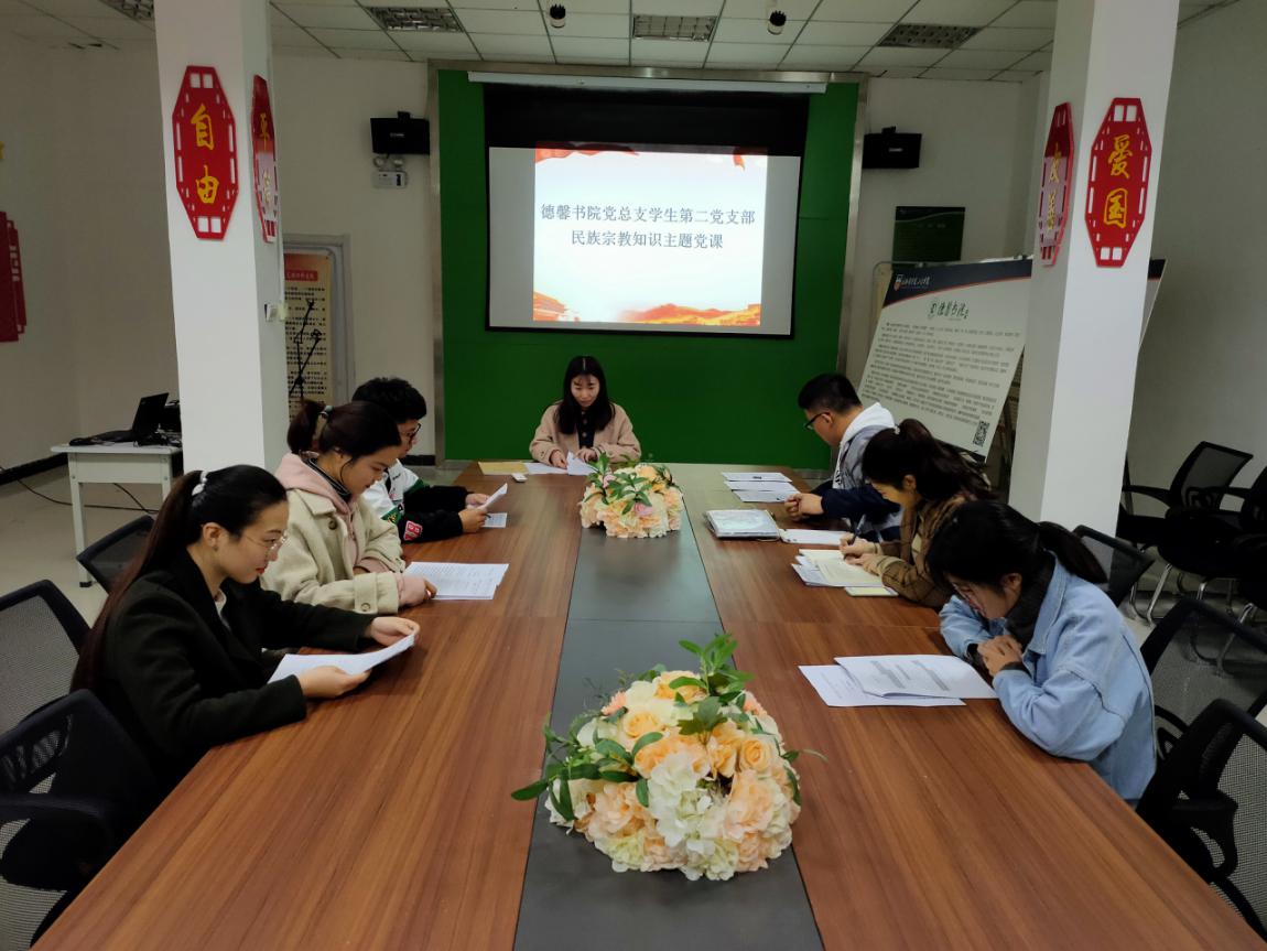 为了普及宗教知识,宣传国家有关法律法规,促进大学生树立马克思主义宗教观和学法遵法守法用法意识,提高学生正确认识和对待宗教问题的能力,同时引导同学们坚定信念,树立正确的世界观、人生观和价值观,11月12日,德馨书院学生第二党支部开展了以“学习民族宗教知识,树立正确宗教观念”为主题的民族宗教知识课。