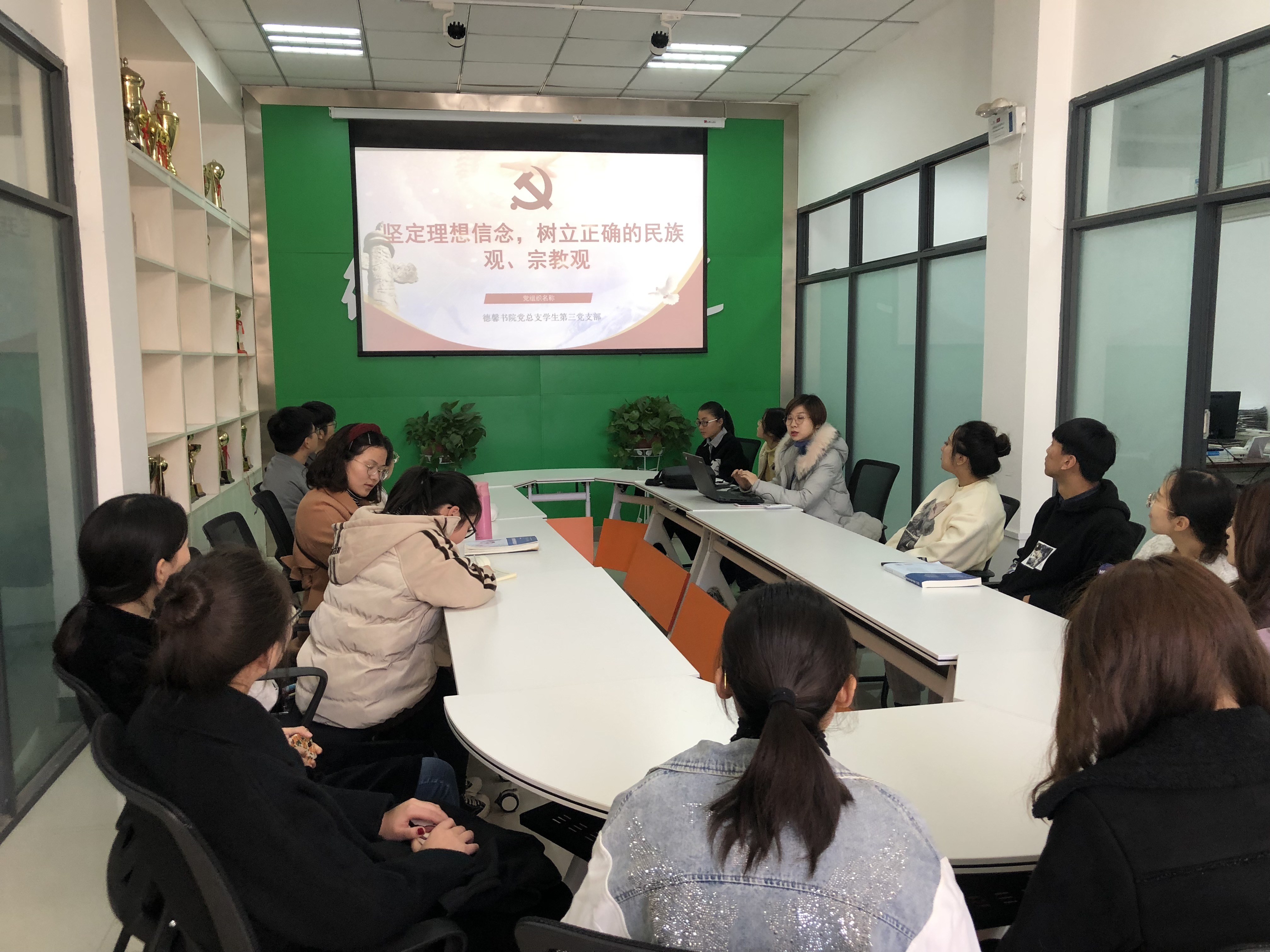 为深入开展宗教相关政策法规专题学习教育活动,充分发挥学生党员思想引领和模范带动作用,11月15日,德馨书院党总支学生第三党支部书记张晗为大家讲授了一节“坚定理想信念,树立正确的民族观、宗教观”专题党课,会议在德馨书院党务活动室召开,学生第三党支部所有党员参加本次活动。