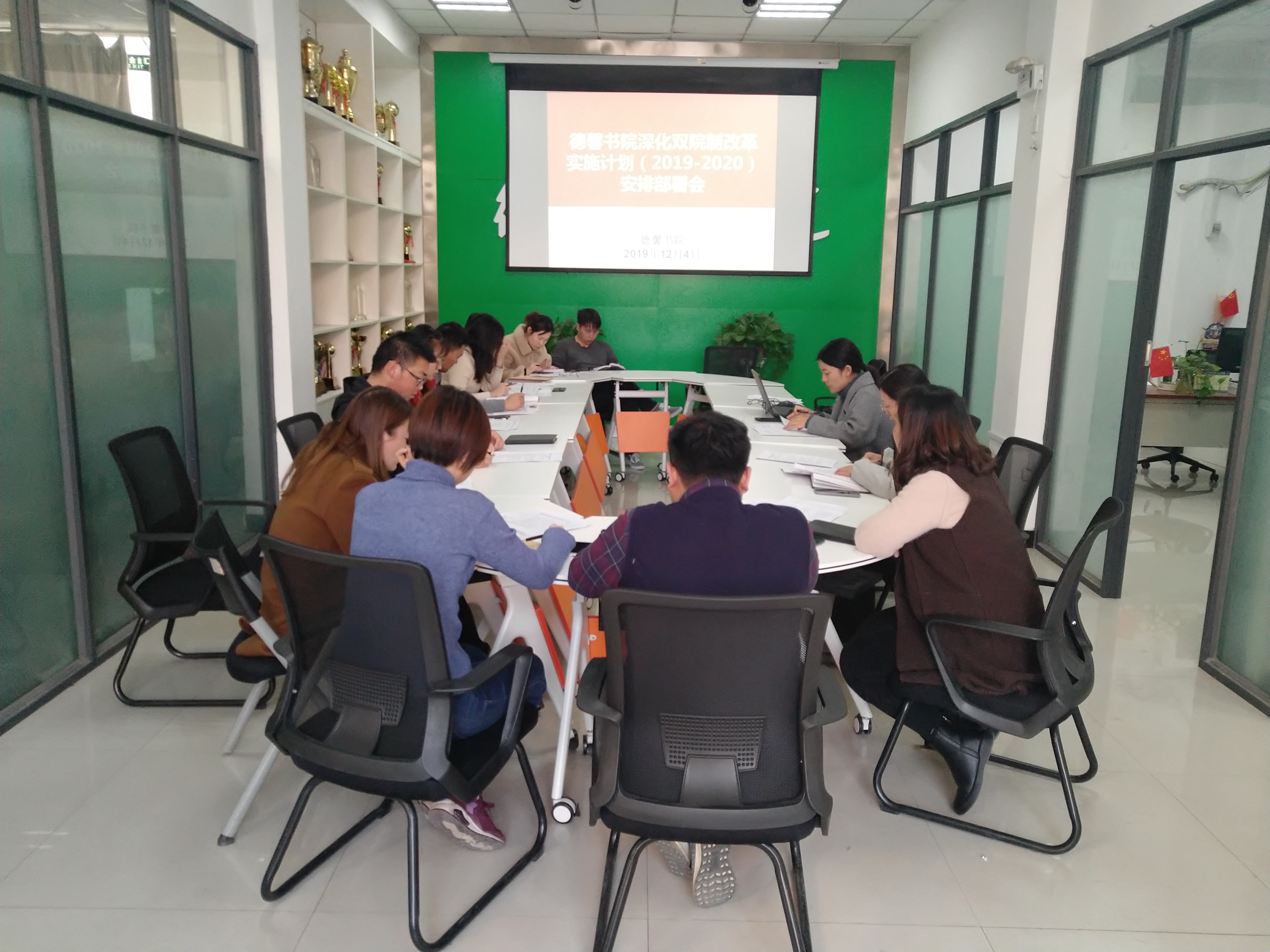 为深入推进德馨书院双院制改革,根据《新乡医学院三全学院深化双院制改革实施方案》,结合书院实际,德馨书院制定了深化双院制改革实施计划(2019-2020),为做好此项工作,12月4日,德馨书院特召开深化双院制改革实施计划(2019-2020)部署会,德馨书院党总支书记金靖芝、党总支副书记平丹丹及书院全体老师参加了本次部署会。