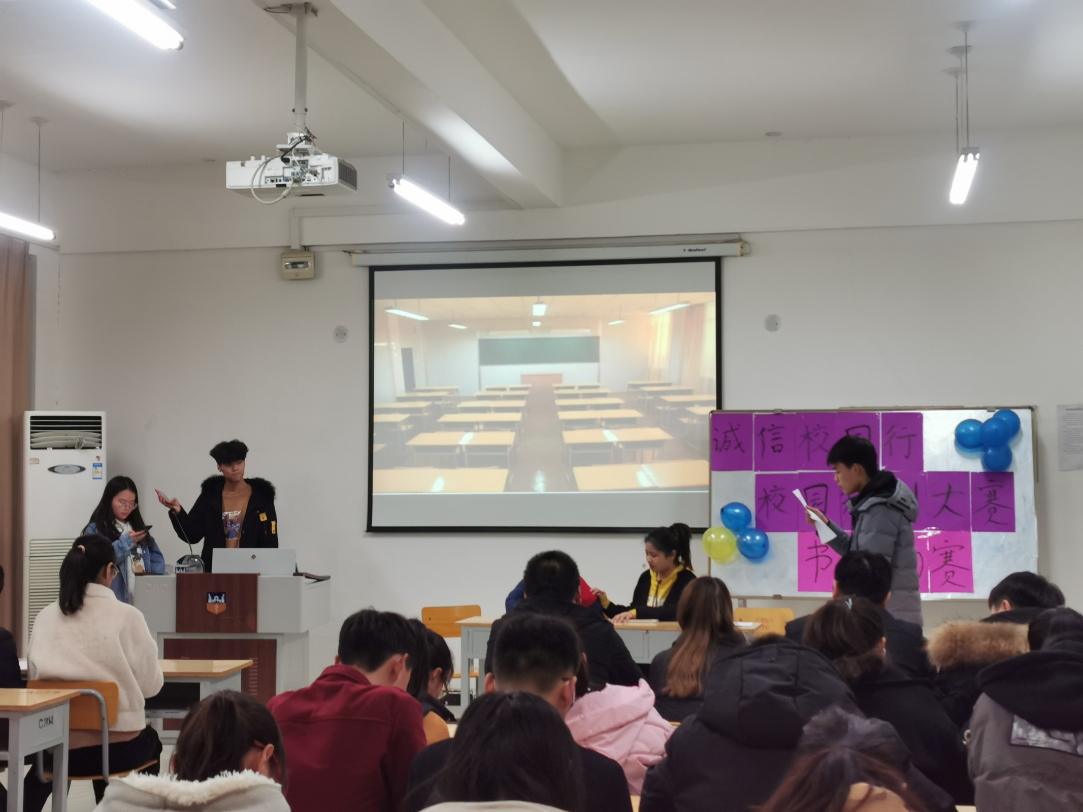 为培养广大学生诚实守信、知恩感恩、自立自强的良好品质,进一步促进我校诚信校园文化建设,12月5日下午,德馨书院特在瑾学楼C204教室举办了“诚信校园行”短剧大赛书院初赛。比赛由德馨书院辅导员王玮老师,张云鹏老师,吴英杰老师,吴兵营老师,郑伟腾老师出席并担任评委,六组参赛人员参加本次比赛。