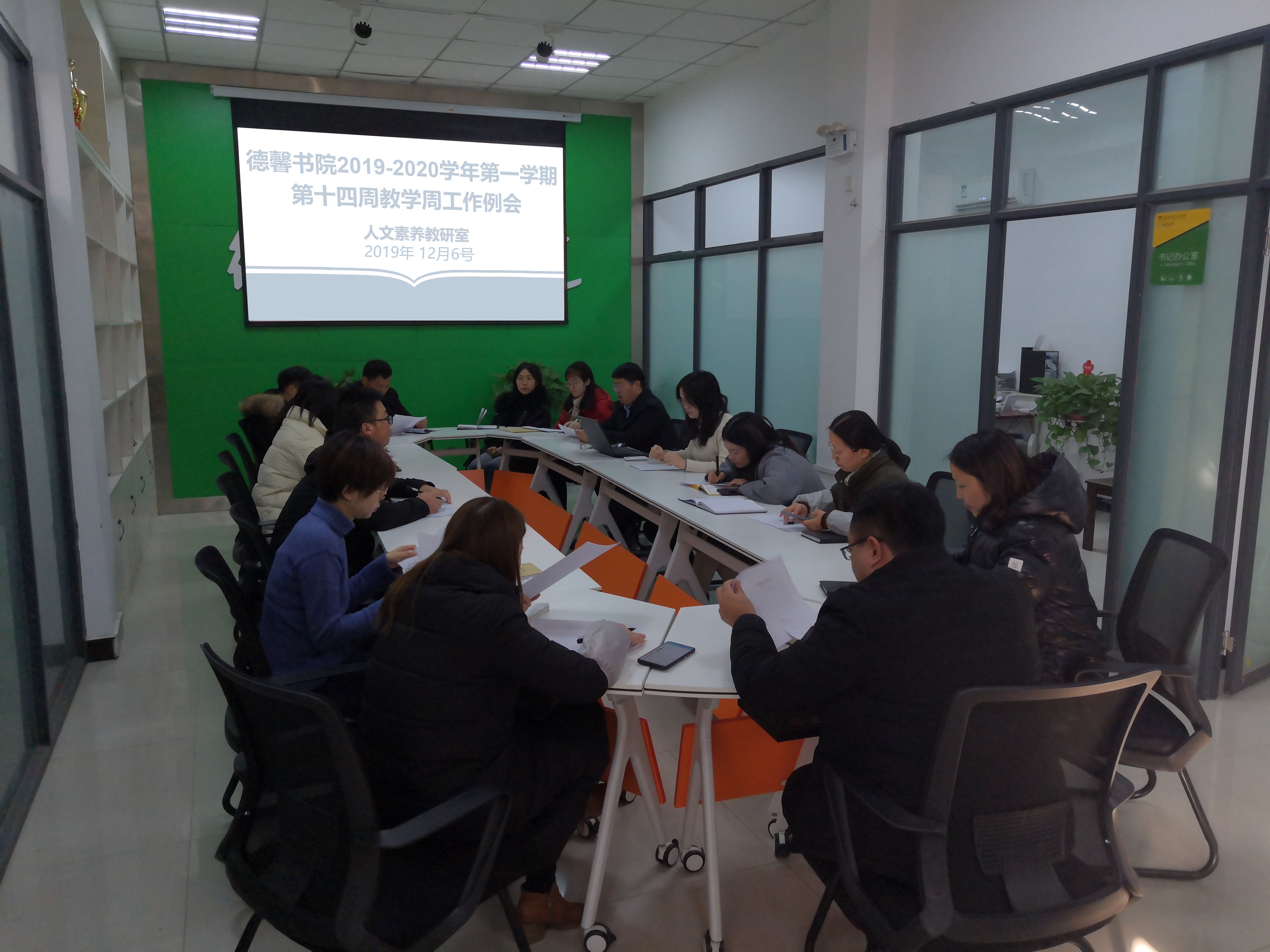2019年12月6日,德馨书院教师在书院办公室召开人文素养教研室本学期第十四周教研活动科研研讨会。
