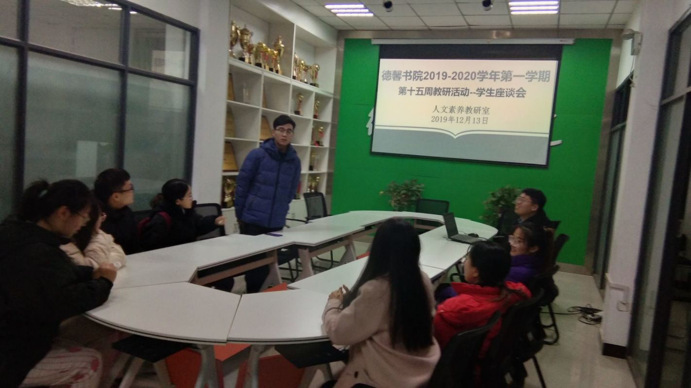 2019年12月13日,德馨书院人文素养教研室在书院办公室召开通识教育课程学生座谈会,任课老师吴英杰以及学生代表参加了会议。