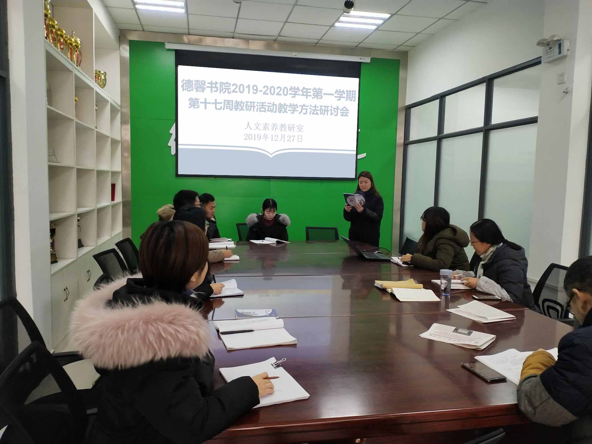 2019年12月27日,德馨书院教师在书院办公室召开人文素养教研室本学期第十七周集体备课活动,教学方法研讨会。