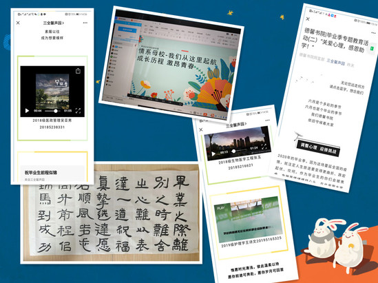 德馨书院依托“三全馨声园”微信平台,通过“毕业说”“青春不散场”等专栏吸引在校师生参与毕业话题讨论,制作推送《毕业生感悟》《致敬祝福》等毕业季视频,营造温馨的网上毕业季氛围。其中《毕业生感悟》引导毕业生用影像记录关于母校的点滴回忆、一草一木,培养他们爱校荣校的深厚情怀;“毕业说”邀请优秀毕业生分享考研、学习、就业经验等,为低年级学弟学妹们答疑解惑,声声祝福传递德馨情,青春接力谱写新篇章。毕业班辅导员通过开展线上主题班会的形式,对毕业生进行爱国主义教育、理想信念教育、遵纪守法教育,引导毕业生做一名有责任感、有担当精神的优秀毕业生。辅导员老师们充分运用抗击新冠肺炎疫情鲜活事例,如郝莺歌、周小宝等等我校在疫情期间表现优秀,做出相当贡献的学生、校友,深入挖掘在抗击新冠肺炎疫情斗争中展示出来的爱国主义精神的新内涵,融入到毕业生最后一次班会中,引导青年学子要主动投身党的伟大事业,融入国家发展大局,到国家需要的地方、人民需要的地方就业创业,扎根人民、奉献国家。