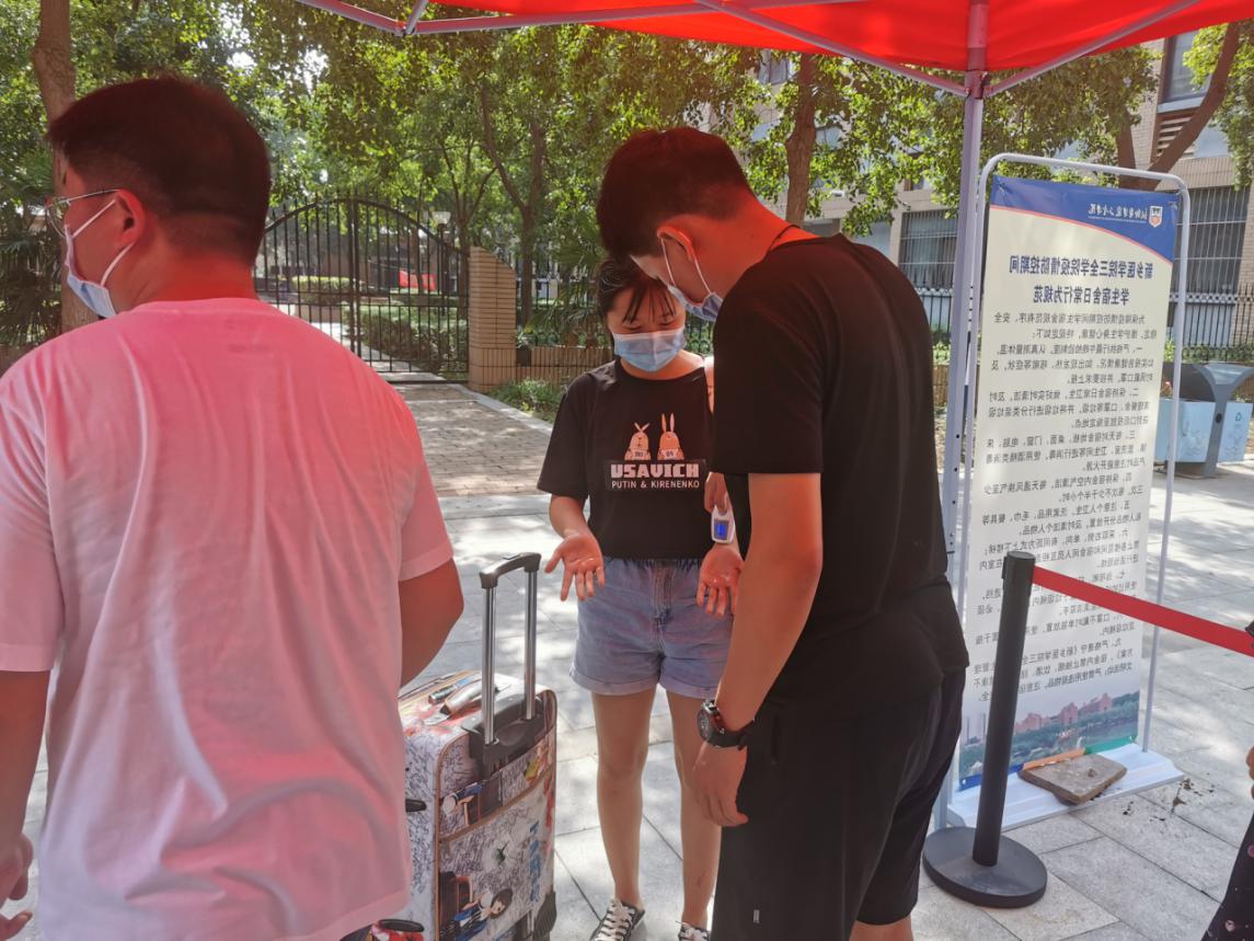 实习生返校前期,德馨书院持续对实习生开展健康状况监测,实行“零报告、日报告”,做好实习生返校途中以及返岗的疫情防控教育。8月11日至8月14日,清晨的阳光洒进德馨书院,德馨书院全体教职工就已经全员待命,迎接实习生的到来。分批返校的实习生到达德馨书院门洞后,持身份证、学生证、健康码和新型冠状病毒咽拭子核酸检测报告,在宿舍门洞内外排成U字形通道排队(间隔1米)接受体温检测,体温检测合格后方可进入宿舍,并在入校后封闭管理,于次日乘坐实习生接送专车由辅导员送至南阳、三门峡、平顶山、洛阳、漯河、郑州等地的实习医院。