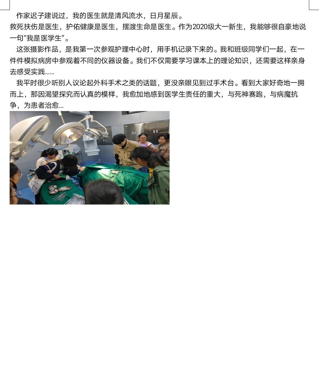 我们已经踏上了全新的生活道路,在这条道路上坚定不移的前进,我们终将成为二十一世纪人类健康的捍卫者和生命科学的开拓者,所以作为医学生的我们为了万千病患,也为了人类的医疗卫生事业,要在这条道路上不断的充实自己,完善自己,发展自己,让我们在未来的工作中能够更好的救死扶伤。“我是医学生”活动不仅增加了同学们作为医学生的自信,而且提升了大家的精神风貌,让我们能在未来的生活中能够更加认真的学习医学技能,在未来与开始与病魔斗争,与死神赛跑,怀仁心以济世,借仁术而活人,誓为肩上无数生命之健康鞠躬尽瘁。