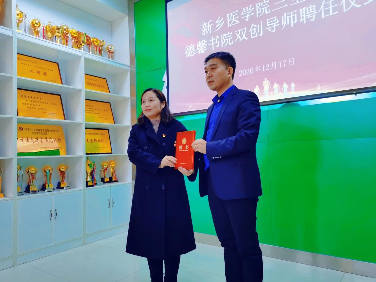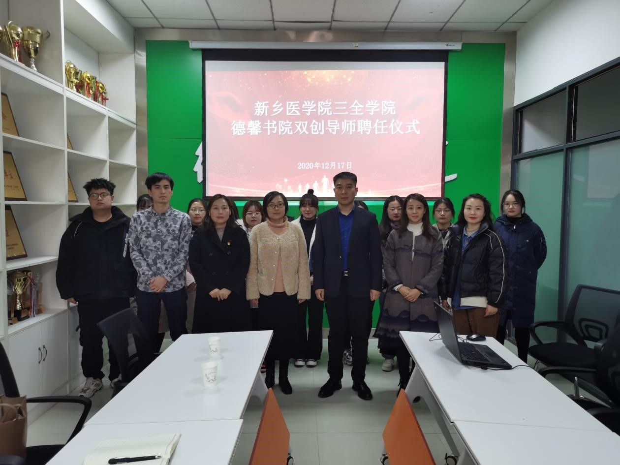 为了培养大学生创新创业能力,让同学们更深刻的了解创新创业的形势,统筹推进“六位一体”双创工作布局,加强双创教育和实践导师队伍建设,不断吸引校内外名师专家加入到德馨书院双创导师团队,新乡医学院三全学院德馨书院于12月17日特举办本次“双创导师聘任仪式”,新乡医学院三全学院健康管理学院党总支书记贾臻、新乡医学院三全学院德馨书院党总支副书记平丹丹,以及2019级健康管理专业的学生代表参加本次聘任仪式。