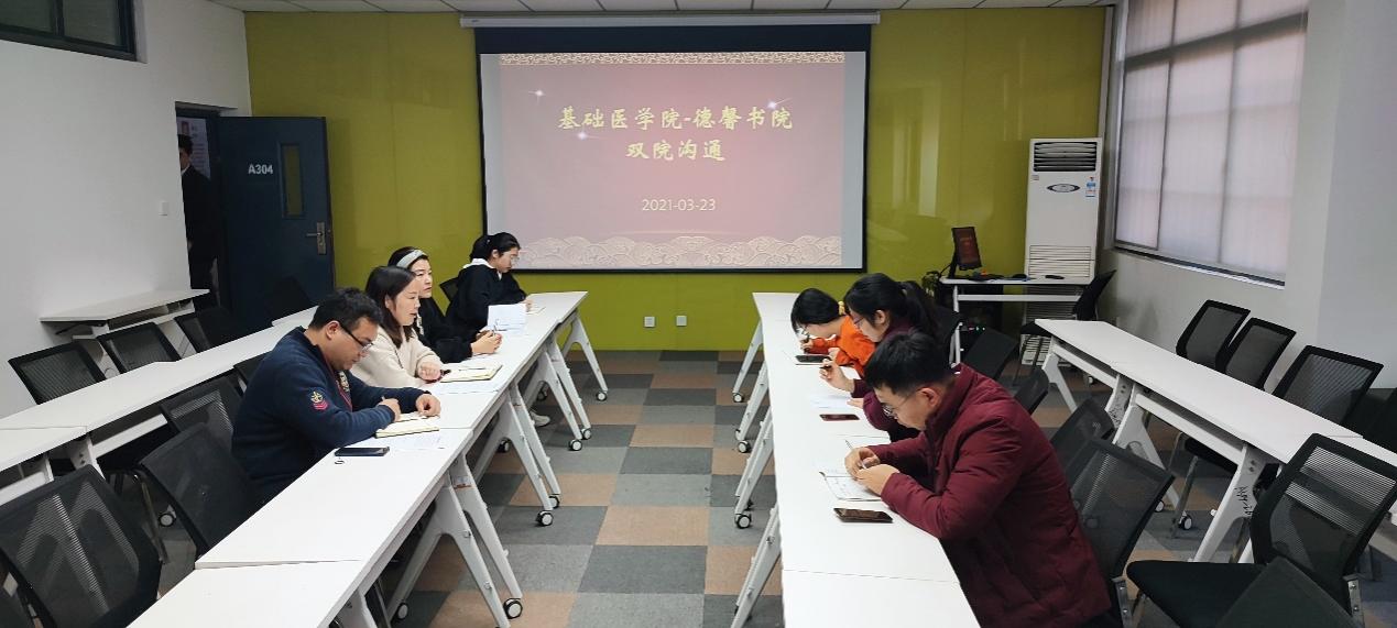 为深入推进落实学校双院制改革,3月23日下午,基础医学院副院长苗莹莹及教师代表与德馨书院党总支副书记平丹丹、辅导员代表和学生代表在励学楼A304召开双院沟通会。