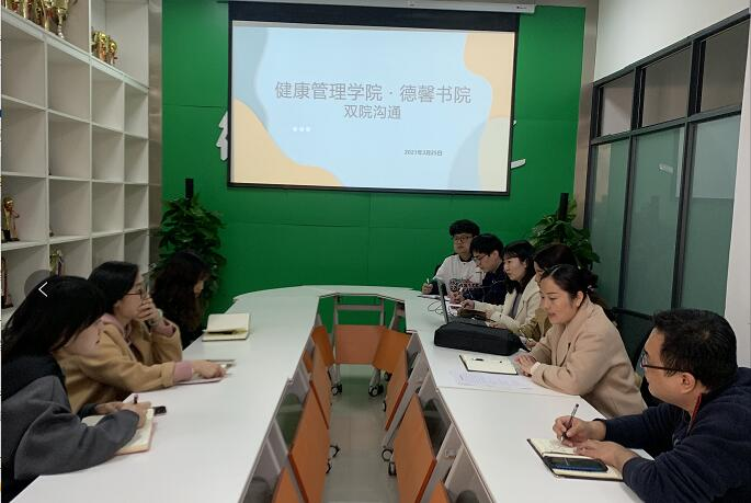 会议中,德馨书院党总支副书记平丹丹介绍德馨书院各专业及学生情况,以及总结去年以来德馨书院探索“1+1>2”得双院育人新模式下与健康管理学院共同开展得活动取得显著效果。随后,贾臻书记就德馨书院专题讲座、主题班会等多种工作形式给出建议,要切实安排大学生科研辅导,要着力提高大学生科研能力,明确指出双院后续如何深度合作,使双院沟通交流不仅促进学院、书院的互动与融合,进一步提高育人工作的效率和成效。德馨书院党总支副书记平丹丹提出联合举办毕业生招聘会的提议,希望学院能够结合“设置专业较多、但是单个专业人数较少”的优势,在学生就业方面给予更多个性化指导,增强双院品牌项目活动融合等具有建设性的问题以及解决方案。平丹丹书记最后总结到,希望借此机会增进双院的交流与互动,切实建立书院与院系的长效沟通机制。