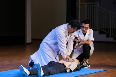 基础医学院全阳老师和毛文峰老师为大家进行了详细的心肺复苏讲解与示范,并现场模拟急救场景对“昏迷患者”进行施救。在演示的过程中,现场师生融入了急救现场,五百多名学生纷纷效仿示范老师尝试急救按压动作,热情度高涨。随后针对学生群体容易出现的高发意外列举了一系列经典案例小故事,让中学生通过这些鲜活的案例,提高自身预警判断能力,掌握了正确的处理方式。