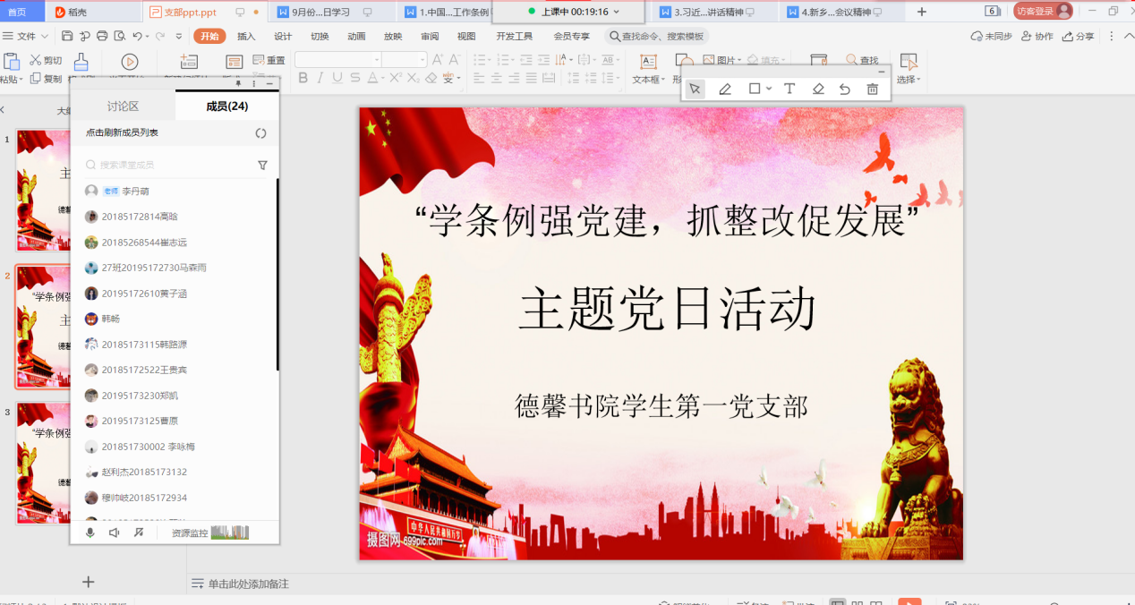 为深入贯彻习近平新时代中国特色社会主义思想,贯彻落实新时代党的建设总要求和新时代党的组织路线,推进党的组织工作科学化制度化规范化,提高党的组织工作质量,9月25日德馨书院学生第一党支部在腾讯课堂开展了“学条例强党建,抓整改促发展”主题党日活动。