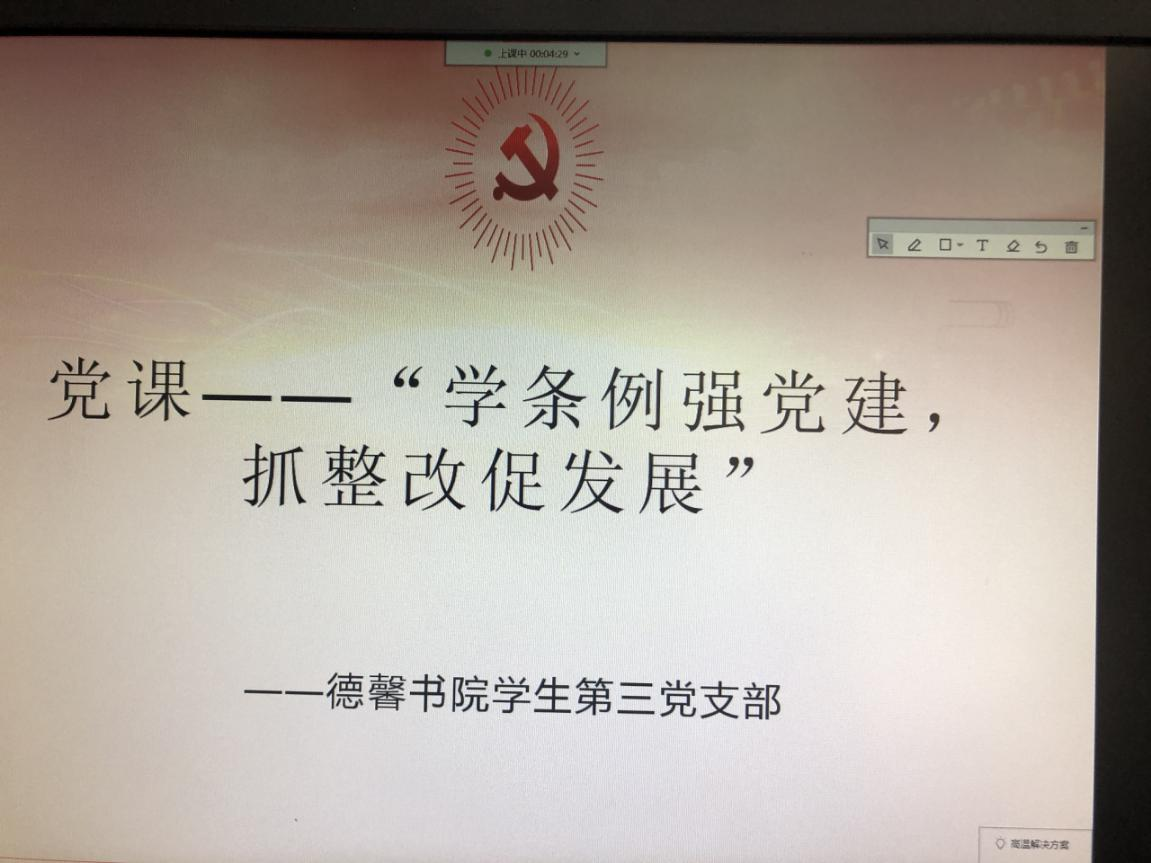 根据学院工作要求,德馨书院学生第三党支部于9月25日线上召开了“学条例强党建,抓整改促发展”主题党日活动,党支部全体党员参加本次活动。