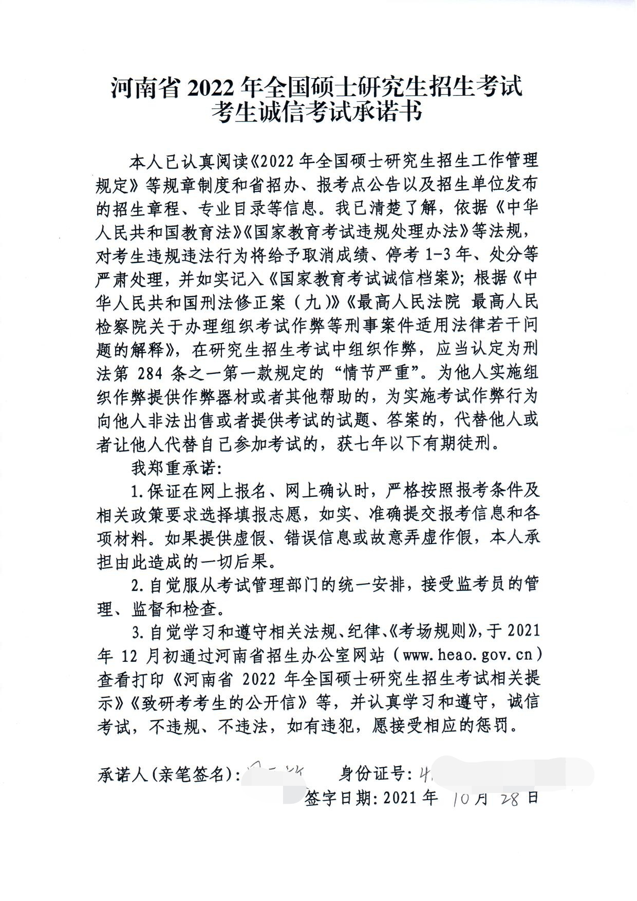 (5)《河南省2022年全国硕士研究生招生考试考生诚信考试承诺书》考生本人亲笔签名照(请登录网址http://www.heao.gov.cn/attach/file/20211025/20211025114520_0290.