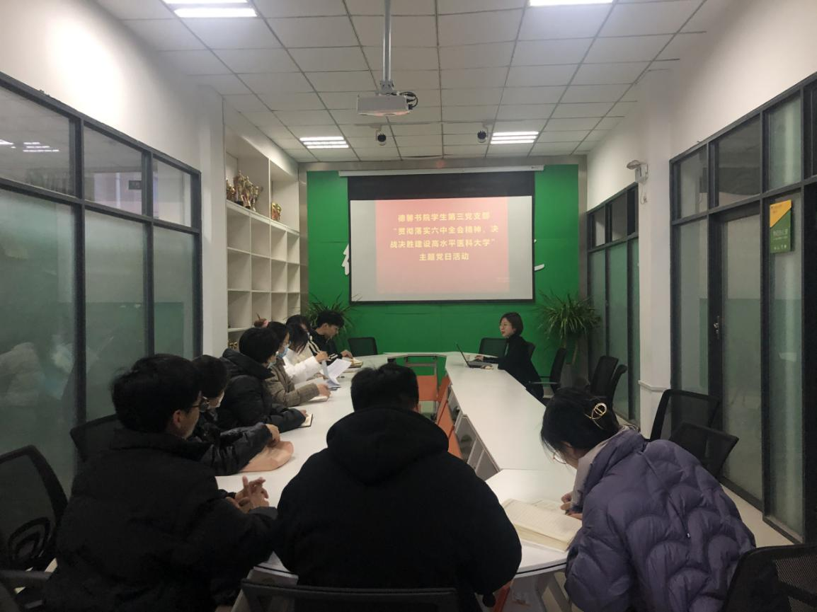 根据学院工作要求,德馨书院学生会第三党支部于12月23日召开“贯彻落实六中全会精神,决战决胜建设高水平医科大学”主题党日活动,党支部全体党员参加本次活动。