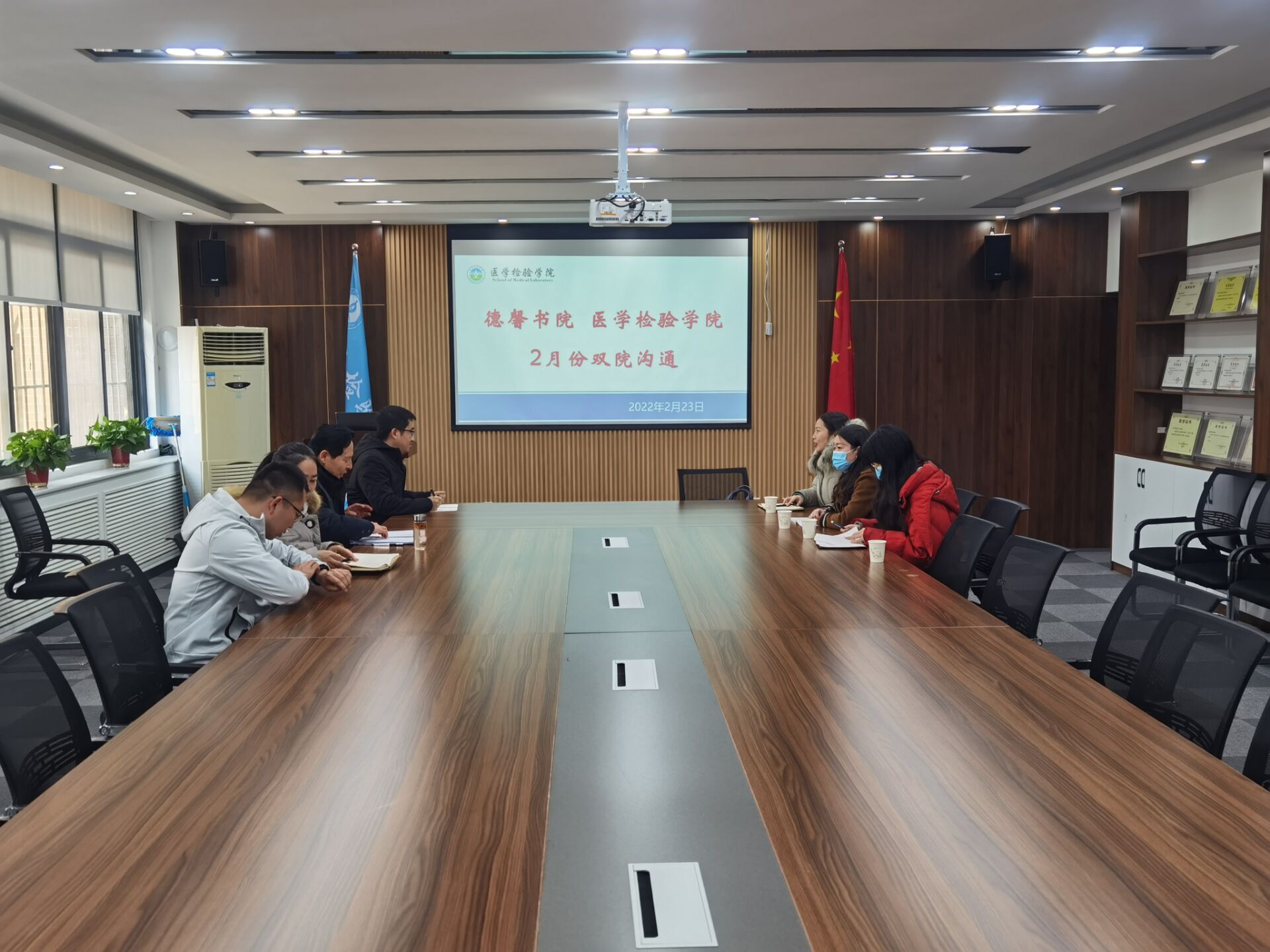 为落实双院制协同育人,进一步加强书院与院系直接的沟通与联系,更好地服务学生,2月23日,德馨书院同医学检验学院召开了2月份双院沟通会议。本次会议以提升学生实践能力、培养具有良好职业素养的高层次应用型专门人才为宗旨,构建三位一体培养模式,从双院制引领护航、双导师联合培养、助力学生考研三大模块入手,改革过去高校一厢情愿的联合培养机制,深化联合培养模式,切实提高本科检验专业学生实践能力及考研上岸率。会议主要从以下方面展开讨论:商讨双院共建良好学风方案,强化学业导师指责问题,医学检验院专职老师定期到书院进行线下辅导,有针对性地强化训练,在答疑解惑、复试指导、调剂服务等方面持续发力,以提高检验专业考研率。在场教师充分交换了意见和建议,德馨书院辅导员李丹萌表示:“希望能够充分发挥学业导师的作用,目前考研复试在即,希望院系老师能够给予专业的指导。”贺志安院长表示:“非常支持为考研学子提供专业指导的想法,院系和书院一定深度合作,协力举办面试指导会,为考研学子铺路架桥。”