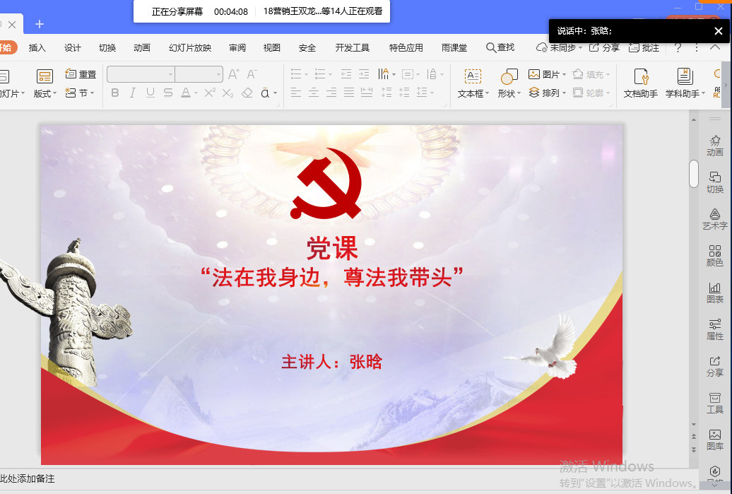 为深入落实习近平总书记关于教育的重要论述、习近平总书记法治思想和教育系统“八五”普法规划,根据我校四月主题党日活动及四月政治理论学习要求,德馨书院学生第三党支部于4月18日,通过QQ课堂召开本月“法在我身边,尊法我带头”主题党日活动及四月政治理论学习,党支部全体党员参加本次活动。