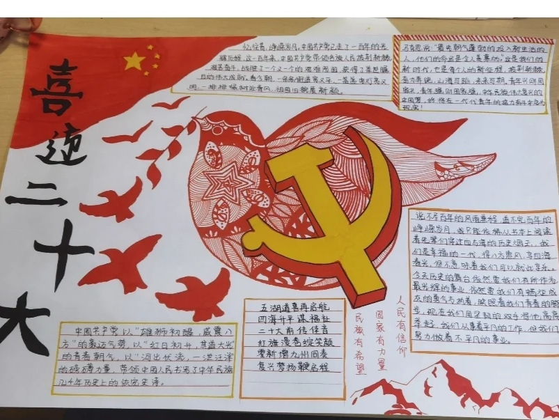 活动第一天,团队成员收集了二十大相关资料并商量如何开展此次活动。第二天负责人带领青年观看了影片《我和我的父辈》,在影片中,大家被抗日战争中冀中骑兵团的英勇奋战所感动,被普通航天家庭父母一辈艰苦奋斗、无私奉献的航天精神所震撼,被少年坚定追求科学梦想的伟大梦想而感动。第三天,团队举办了线上会议介绍二十大,并在接下来的几天通过自己的方式演绎二十大,比如诗歌朗诵,唱歌,手抄报等。第七天,通过线上会议总结本次社会实践活动,传递庆祝建党百年激情的爱党爱国的热情,营造团结奋进的浓厚氛围。