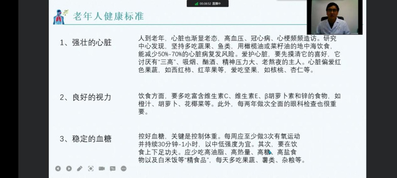 为了积极宣传并响应《中共中央国务院关于加强新时代老龄工作的意见》中的各项方针政策,在城乡社区加强老年健康知识宣传和教育,提升老年人身体素质,“一馨一医,敬老返乡”健康宣讲小分队于7月5日至7月6日开展“一加三”云端宣讲会。