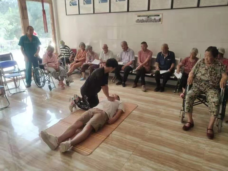 活动共分为急救知识宣讲和急救知识有奖竞答两个环节。第一环节,团队为养老院的老人们详细讲解了心肌梗塞的发现及预防的措施、心肺复苏的操作步骤及相关注意事项等紧急救护技术,并在现场做了心肺复苏的分解演示。队员们又将急救知识以宣传页的形式发放,让老人们更好的理解。第二环节,团队根据所讲解的急救知识设置问题进行提问,老人们积极回答,现场气氛热闹温馨。竞答结束后,参与活动的老人们都得到了团队准备的小礼物。