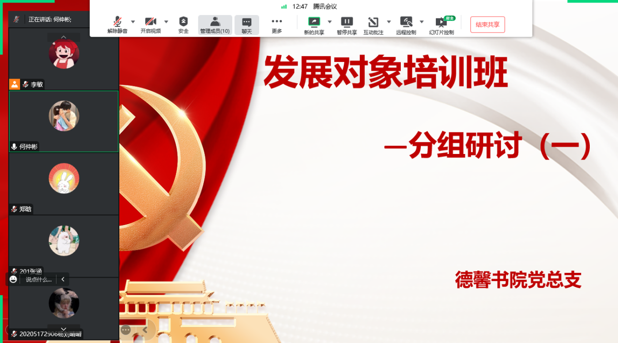 讨论围绕“中国共产党章程”,首先本次发展对象李敏说,“作为一名入党积极分子,时刻牢记共产党员是中国工人阶级的先锋战士,时刻牢记全心全意为人民服务的宗旨,时刻牢记共产党员永远是劳动人民的普遍一员,时刻树立党员意识,这是保持共产党员先进性最普遍、最基本的要求。只有自觉做到这几点,才能保持共产党员的蓬勃朝气、浩然正气。 我们党是由千千万万个党员个体组成的,只有每个党员自觉遵守党章、贯彻党章、维护党章,我们党才会有希望,党的事业才会兴旺发达。我们的党才能带领全体中国人民实现中华民族伟大复兴的历史使命。”