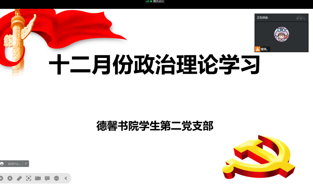 12月26日,德馨书院学生第二党支部在腾讯会议开展十二月份政治理论学习。会议由侯吉昀书记召开,学生第二党支部全体党员参加。