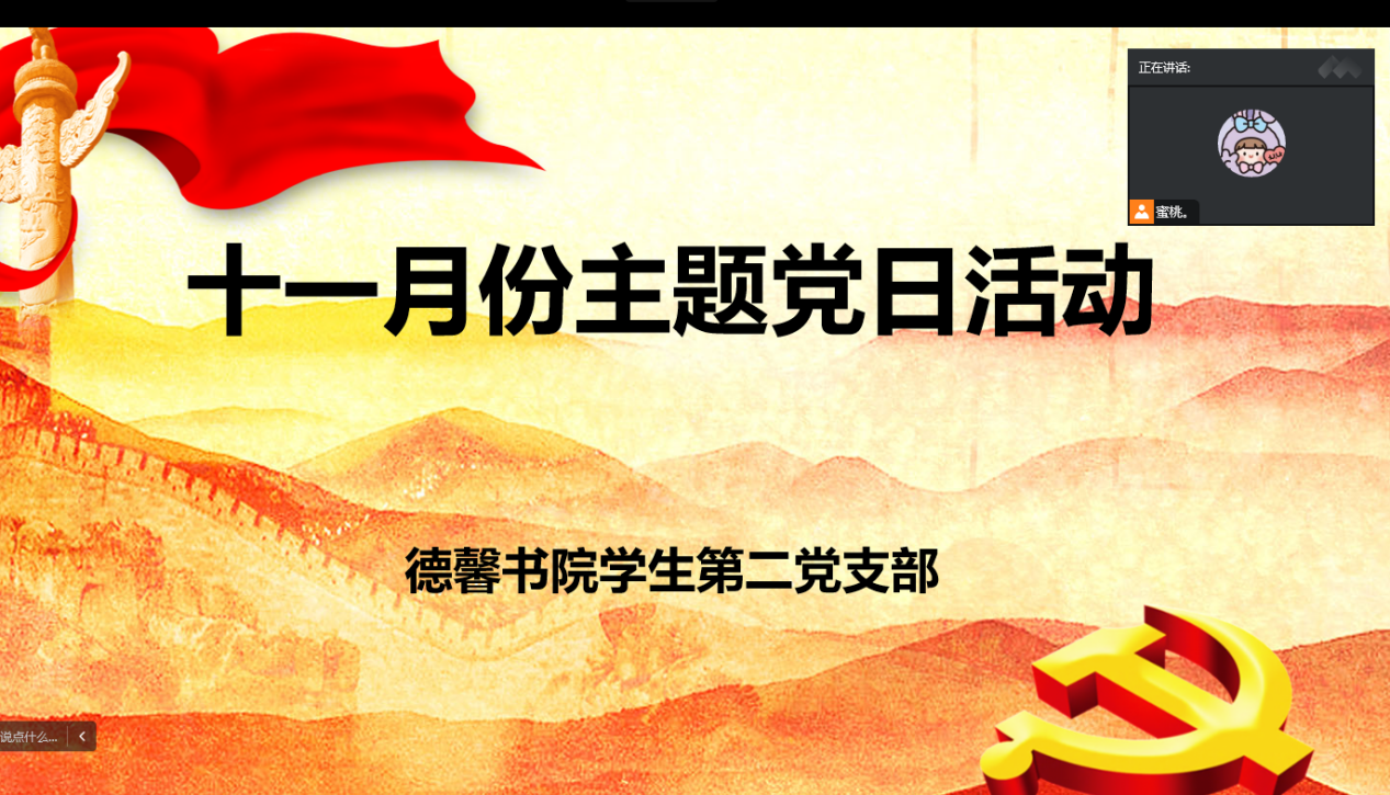 11月25日,德馨书院学生第二党支部在腾讯会议开展“学习贯彻党的二十大精神推动学校事业高质量发展”主题党日活动。会议由侯吉昀书记召开,学生第二党支部全体党员参加。